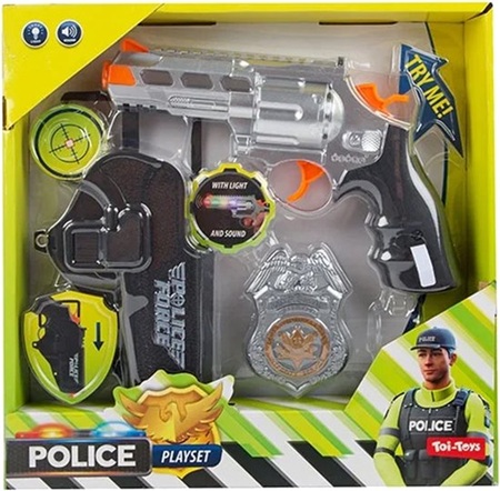 Speelgoed politie pistool met holster en badge. Dit speelgoed geweer heeft verschillende effecten om het spelen nog leuker te maken! Het pistool maakt geluid en geeft licht als je aan het schieten bent. Maak je politie outfit compleet met dit stoere speelgoed geweer. Geschikt voor kinderen. Het pistool wordt geleverd inclusief batterijen.