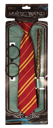 De tovenaarsaccessoireset bevat een bril, een stropdas en een toverstaf.