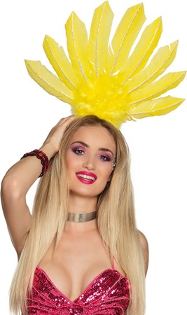 Deze Braziliaanse haarband is voorzien van meerdere gele veren die versierd zijn met zilverkleurige glitters. De haarband is ongeveer 25 cm groot en zal ideaal zijn voor een exotisch carnavalskostuum!