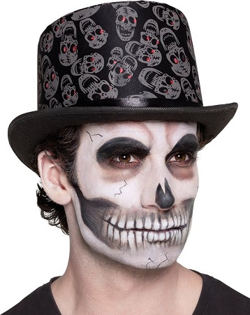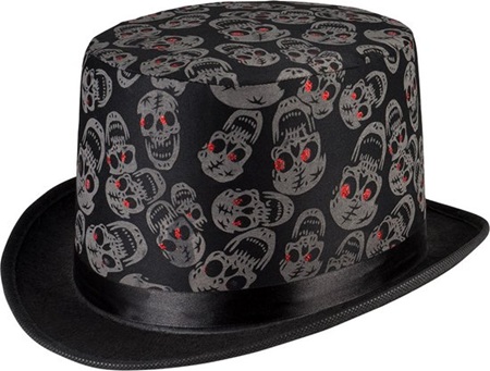 Dit accessoire voor volwassenen is een hoed. Het is zwart en heeft een opdruk van grijze doodskoppen met rode ogen. De hoed zal ideaal zijn om te dragen op een Halloween feest met Dia de los Muertos thema!