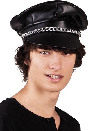 Zwarte pet in leerlook met ketting, rock-, gay disco- of Village People-stijl…