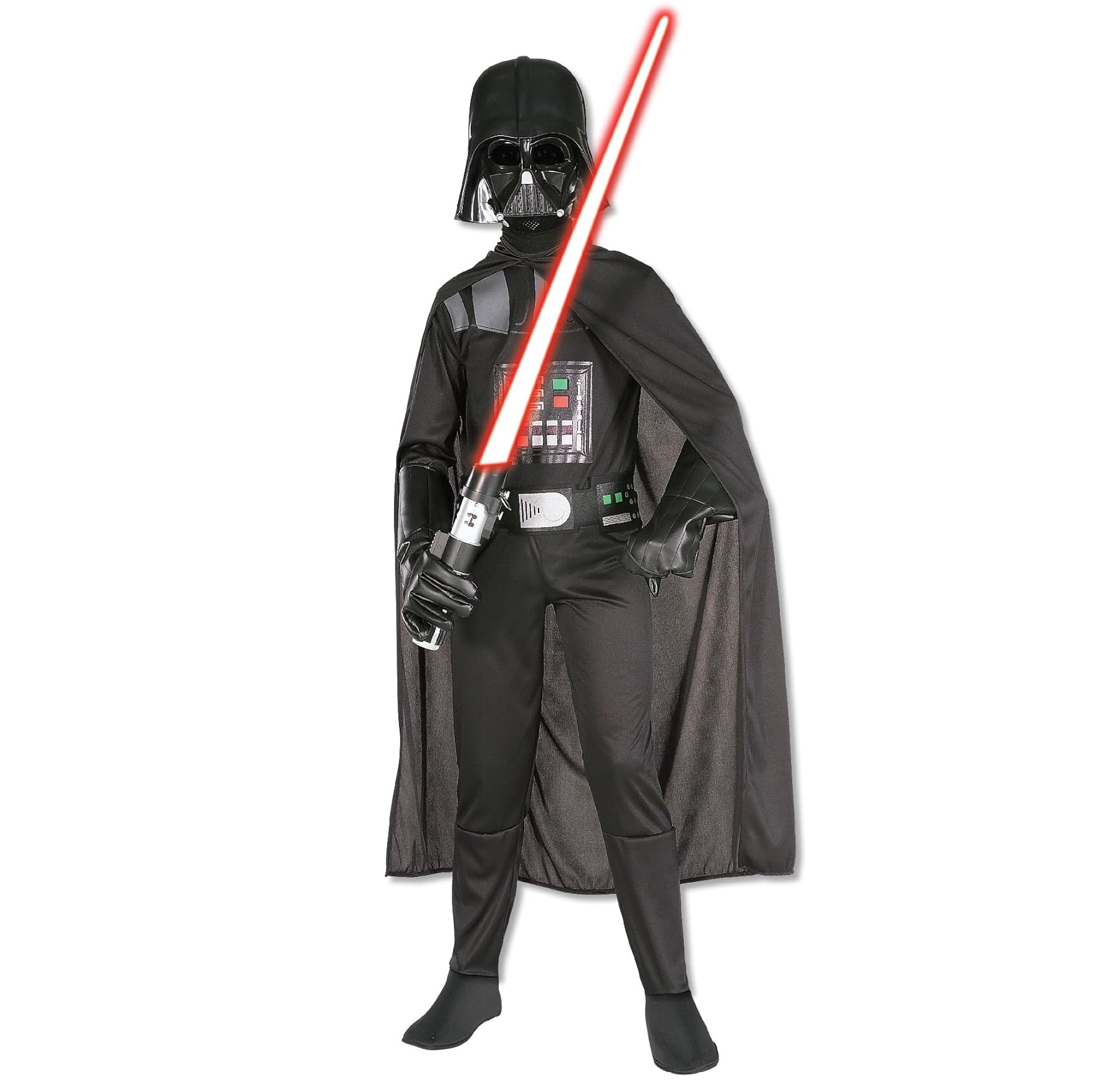 Artikel bevat: Jumpsuit met aangehechte laarzen, riem, cape en masker. Niet inbegrepen op de afbeelding: schoenen, lichtzwaard.