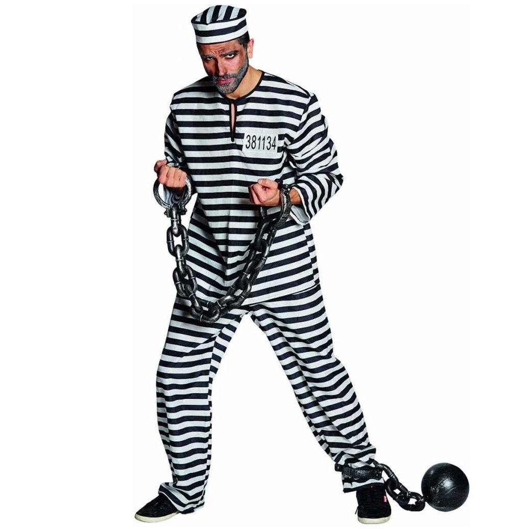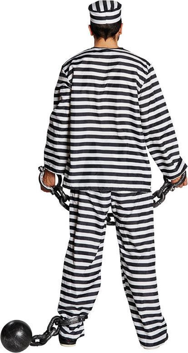 Een driedelig gevangenenkostuum bestaande uit een zwart-wit gestreept bovenstuk, broek en muts. Op de borst staat een gevangenen nummer gedrukt. Accessoires niet inbegrepen