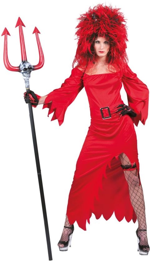 Laat de duivelin in je los met deze adembenemende lange jurk met riem (handschoenen en drietand apart te kopen)