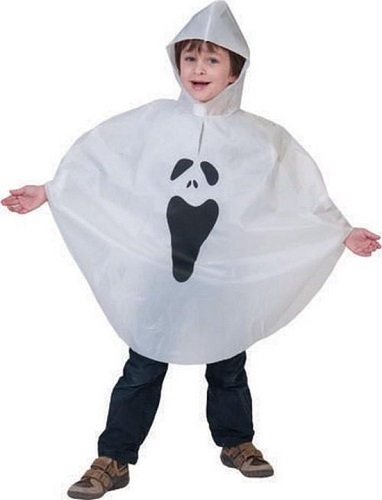 Deze Halloween poncho voor kinderen is waterdicht en licht. De kleur is wit en stelt een spook voor. De kap wordt met behulp van een scratch gesloten. De poncho meet ongeveer 90 cm groot ( zonder de kap). Ideaal voor op een originele manier het Halloween