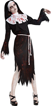 Laat de duisternis toeslaan tijdens Halloween met dit zombie non Halloweenkostuum voor dames in maat S. Deze unieke combinatie van heilige onschuld en ondode chaos biedt een angstaanjagende twist aan een traditioneel nonnenkostuum, waardoor je het middelpunt wordt van elke Halloweenfeest. Het kostuum is leverbaar in diverse maten. De jurk wordt geleverd met een koord en een nonnenkapje.
