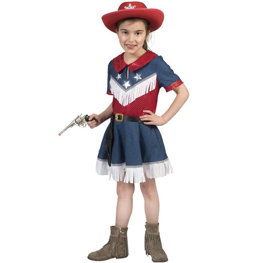Yeeha! Ga lekker line dancen in de dichtstbijzijnde saloon met deze mooie cowgirl jeans jurk voor meisjes (hoed en pistool apart te kopen)