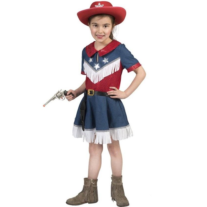 Yeeha! Ga lekker line dancen in de dichtstbijzijnde saloon met deze mooie cowgirl jeans jurk voor meisjes (hoed en pistool apart te kopen)