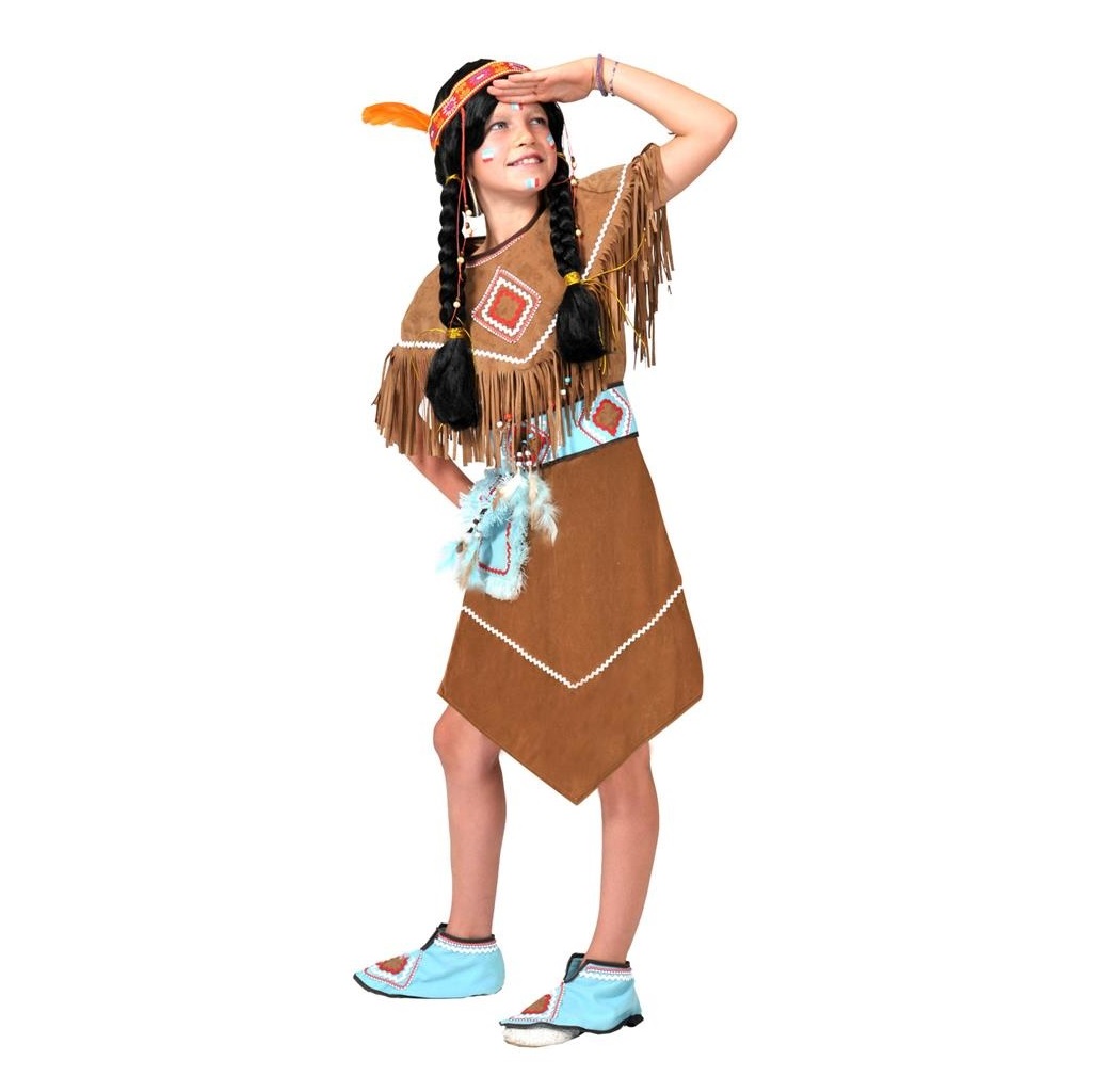 Leuk indianenpakje voor kleine squaws bestaande uit een suedelook jurkje, een riem met beurs en schoenbeschermers, allemaal met kleurige indianenversieringen