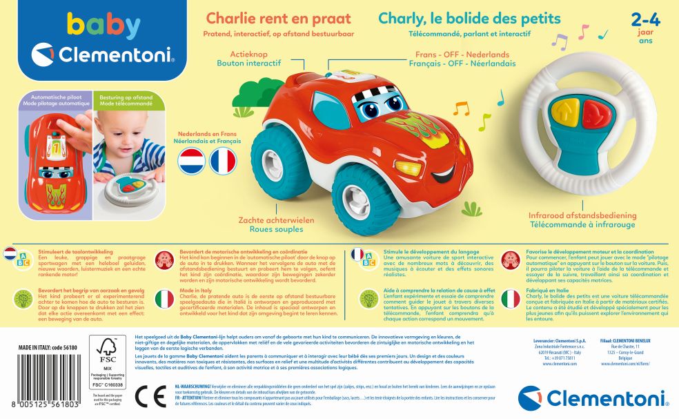 Met zijn vrolijke stem en vele geluiden en muziekjes, zorgt Charlie ervoor dat je kindje spelenderwijs zijn taalontwikkeling stimuleert. Elke keer dat er op een knop wordt gedrukt, begint de auto te bewegen. Dit leert je kleintje al snel het verband tu