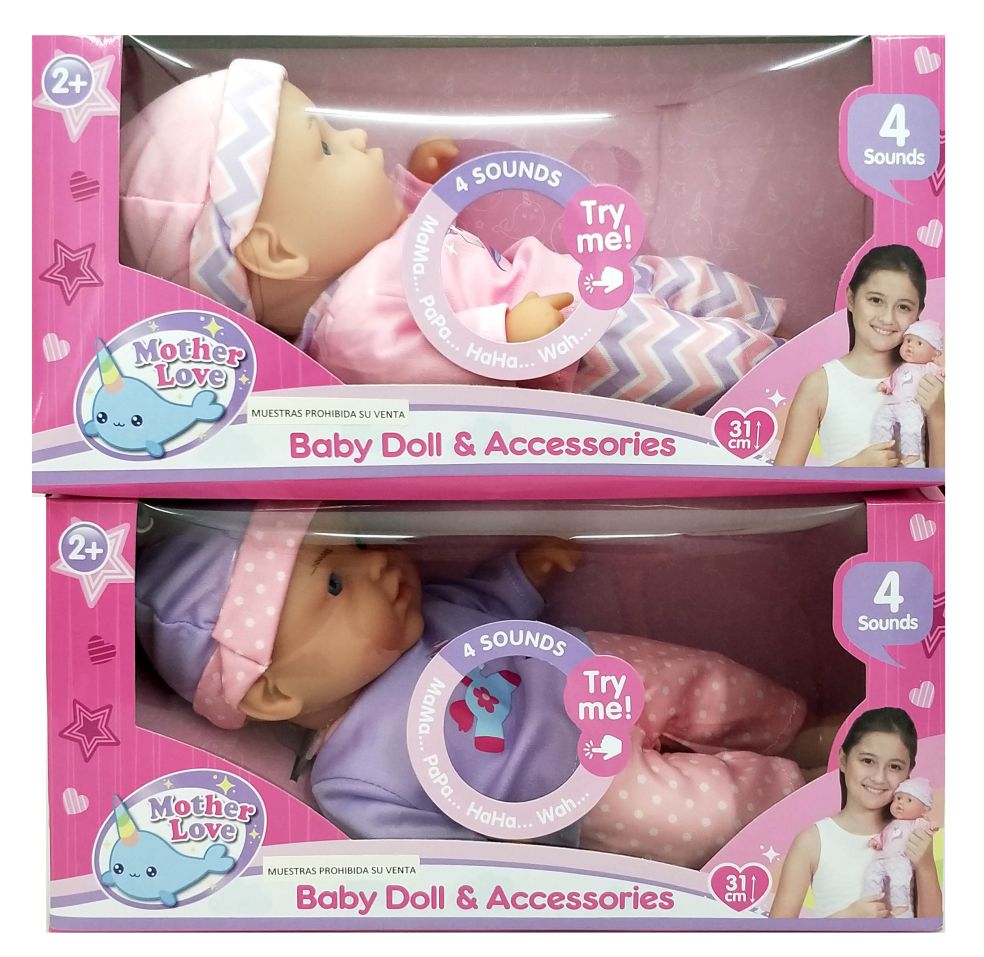 Babypopje (soft body) met geluid - 31cm - Roze OF Paars - 1 exemplaar