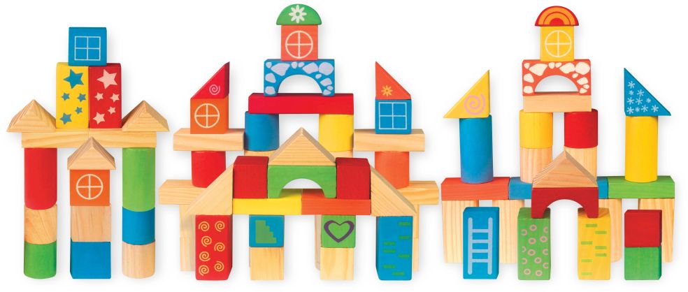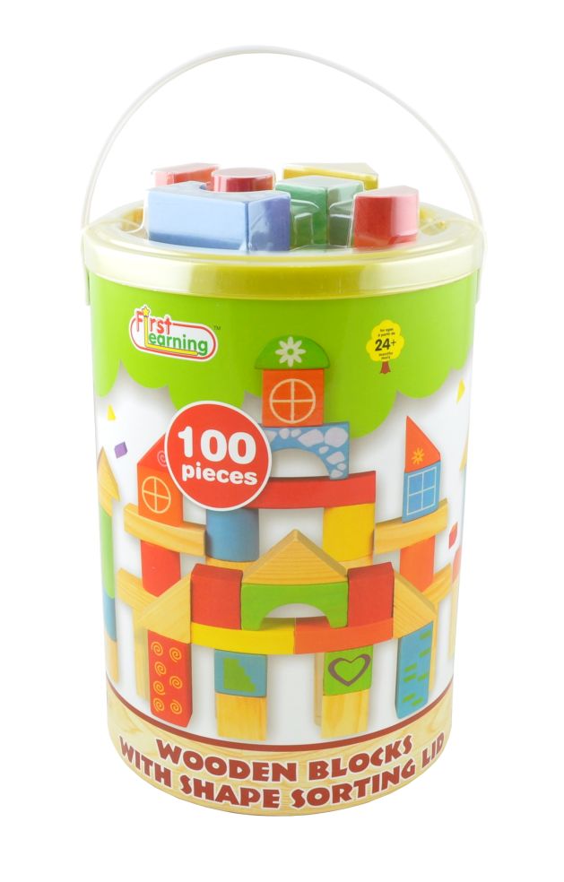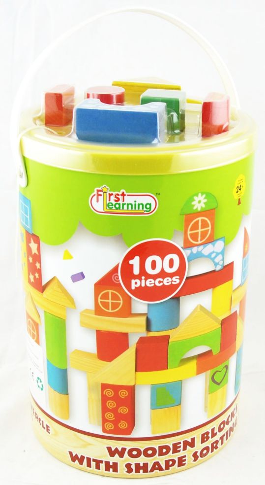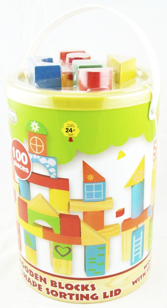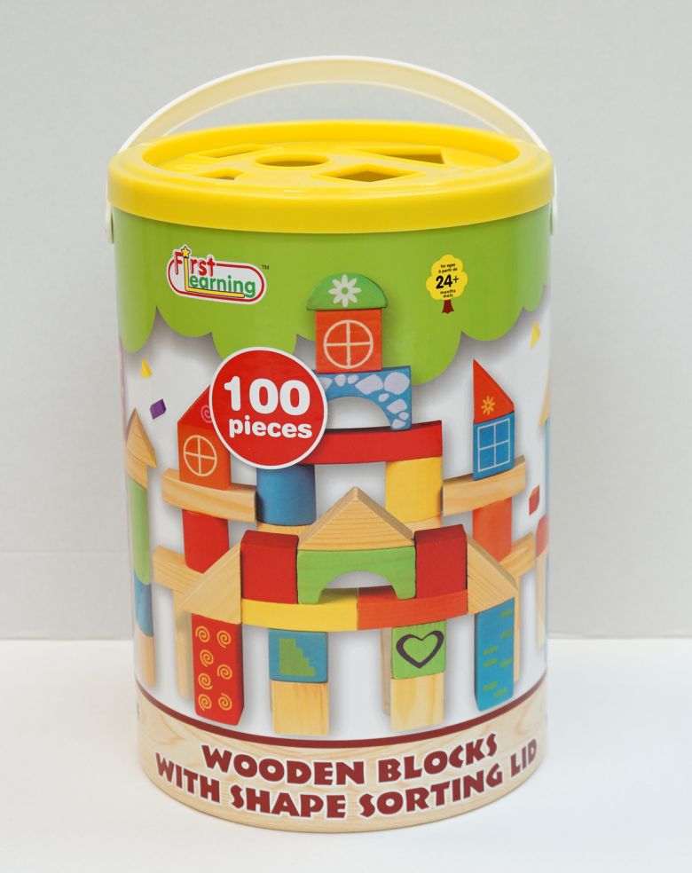 Houten blokken naturel/gekleurd in ton met vormsorteer deksel – 100stuks