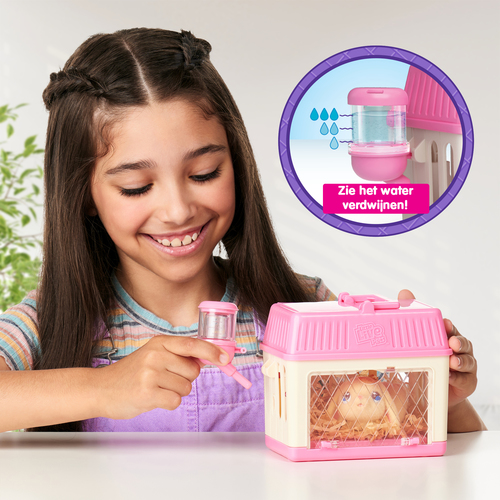 Heb jij altijd al een konijntje willen hebben? Kijk eens hoe schattig dit kleine konijntje in haar roze minihokje is! En dit konijntje wordt mama… maar wanneer? Verzorg mama goed en voed haar met de selderij en haar oogjes zullen sluiten. Zet haar dan op het stro in haar hokje en sluit de deur. Vul de waterfles en kijk hoe het water verdwijnt! Nu is ze klaar om op magische wijze maar liefst 3 baby’s te krijgen! Deze schattige babykonijntjes hebben verschillende poses en worden geleverd met verrassende accessoires, een strik of een slabbetje. Vergeet je niet de geboorteakte in te vullen?