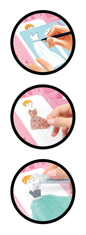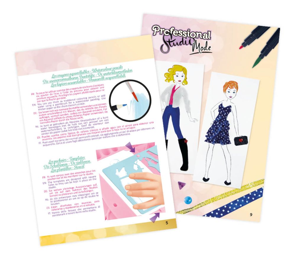 Met deze professionele modestudio ontwerp je jouw eigen outfits en decoreer je ze met de verschillende meegeleverde accessoires. Kies een silhouet, teken kleding met de sjablonen en geef hen volume dankzij de talrijke meegeleverde accessoires. Laat je ins