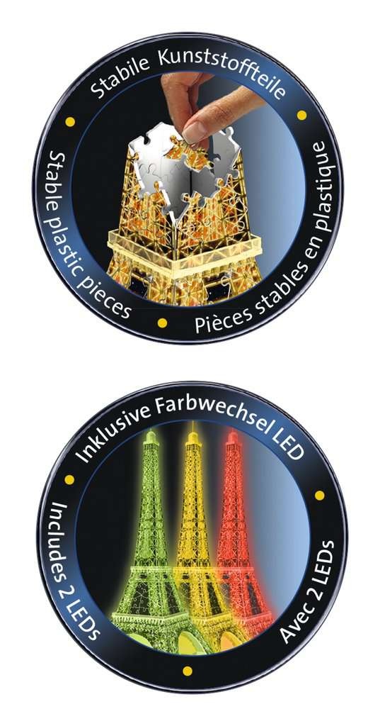 U kunt kiezen tussen een zachte verlichting die lijkt op het origineel of de variant met wisselende kleuren. Een 3D puzzel van Ravensburger. Eiffeltoren bij nacht Parijs wordt niet alleen de stad van de liefde genoemd, maar ook wel de lichtstad – la vi