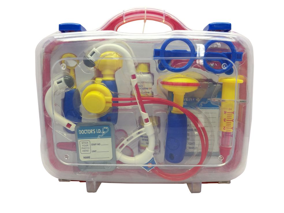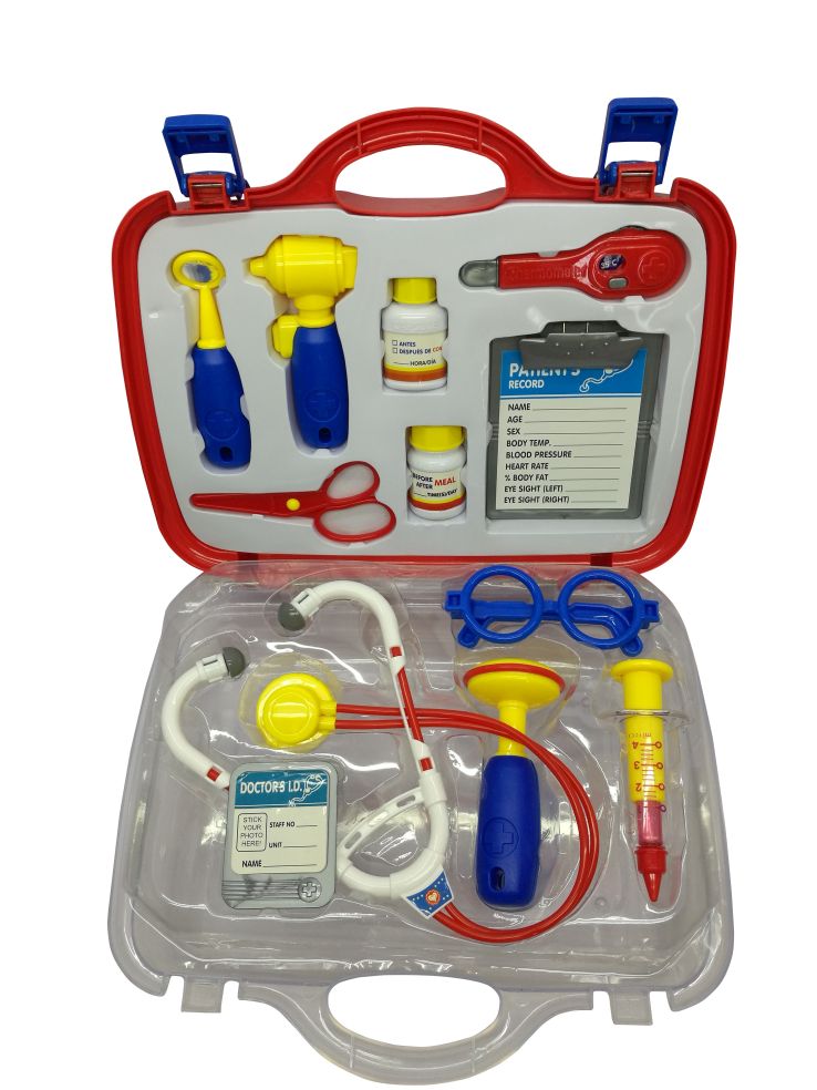 Deze dokterskoffer is gevuld met alles wat een dokter nodig heeft. Bevat o.a. een injectienaald, stethoscoop, hamertje, …
