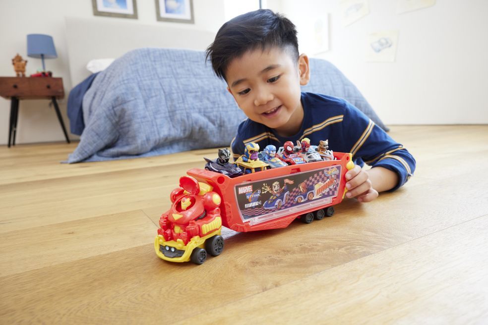 Deze transportwagen met Iron Man-thema is versierd met Stark Racing graphics en kan tot wel 10 Hot Wheels RacerVerse voertuigen of Hot Wheels speelgoedauto’s (schaal 1:64) vervoeren om mee te spelen of om ergens neer te zetten. Kinderen kunnen de cabin