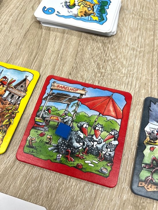 Vlot blufspel voor het hele gezin! Het pluimvee op de boerderij houdt een groot buffet. De vossen uit de omgeving eten ook graag mee, maar die hebben duidelijk een ander beeld van de samenstelling van het menu. Speel pluimveekaarten om graankorrels te