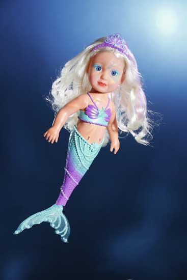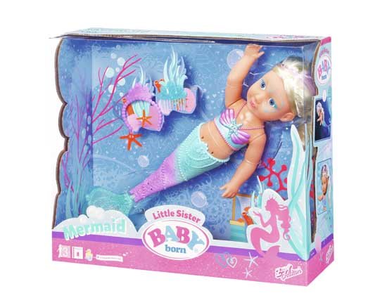 Baby Born Sister Zeemeermin beweegt door het water! Wanneer de pop van 43 cm in contact komt met water, begint ze de staart van haar zeemeermin te bewegen en glijdt ze gracieus door de badkuip of het zwembad. Naast haar uitvoerig versierde vissenstaart draagt ze een bijpassende haltertop gemaakt van schelpen en zeesterren. Het lange blonde haar biedt meer stylingplezier. Omvat: pop met haar, een kam, een tiara.