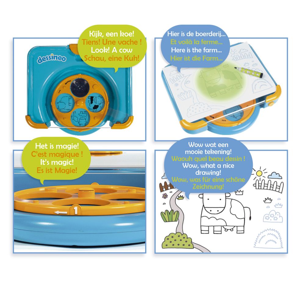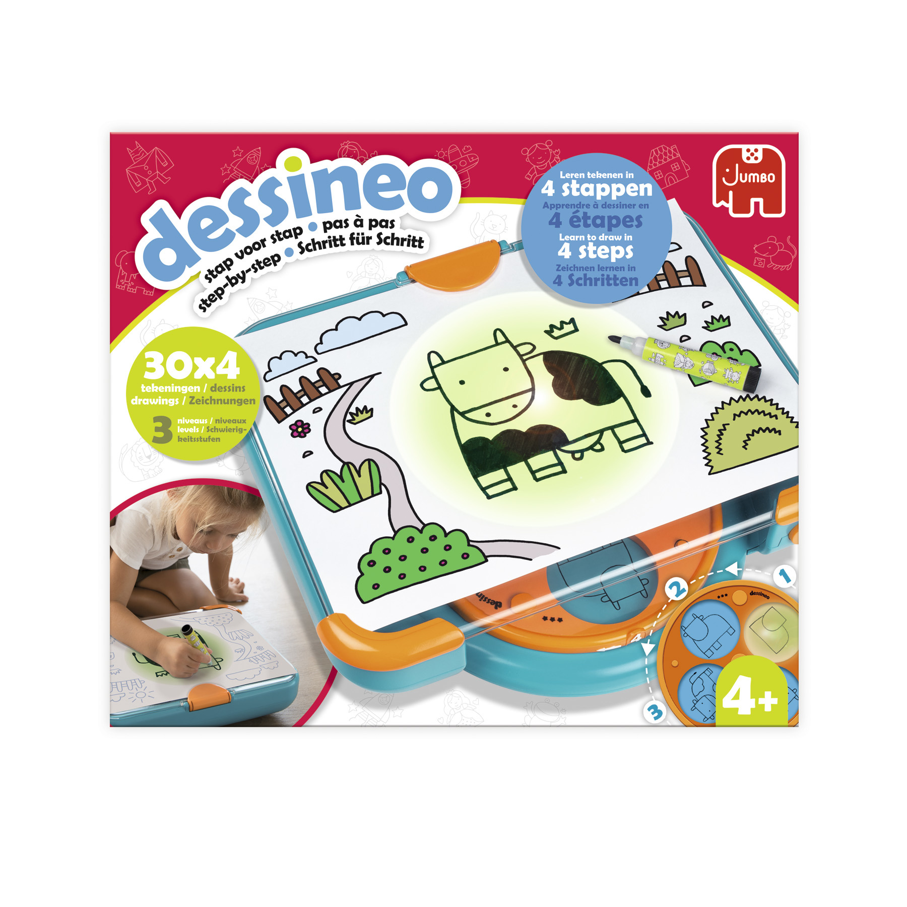 Dessineo is speciaal ontworpen voor kinderen van 4 jaar en ouder. Het kind leert op een eenvoudige en leuke manier stapsgewijs tekenen. Kies een van de transparante sjabloonschijven en leg deze in de draaischijf. Zet de projector aan, draai de schijf naar stap 1 en trek de lijnen over met een stift. Draai de schijf vervolgens door naar stap 2, 3 en 4. De sjablonen lopen op in moeilijkheidsgraad. Alles kan netjes opgeborgen worden in de tekentafel.
