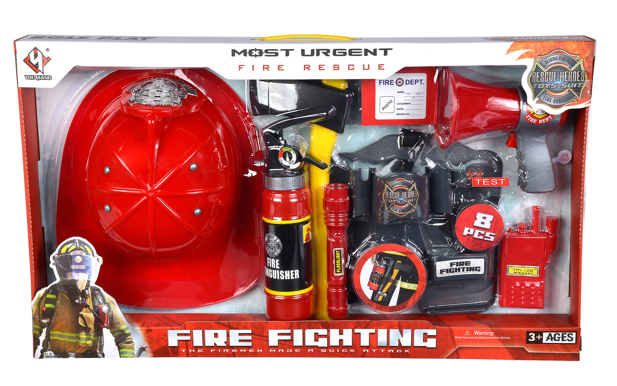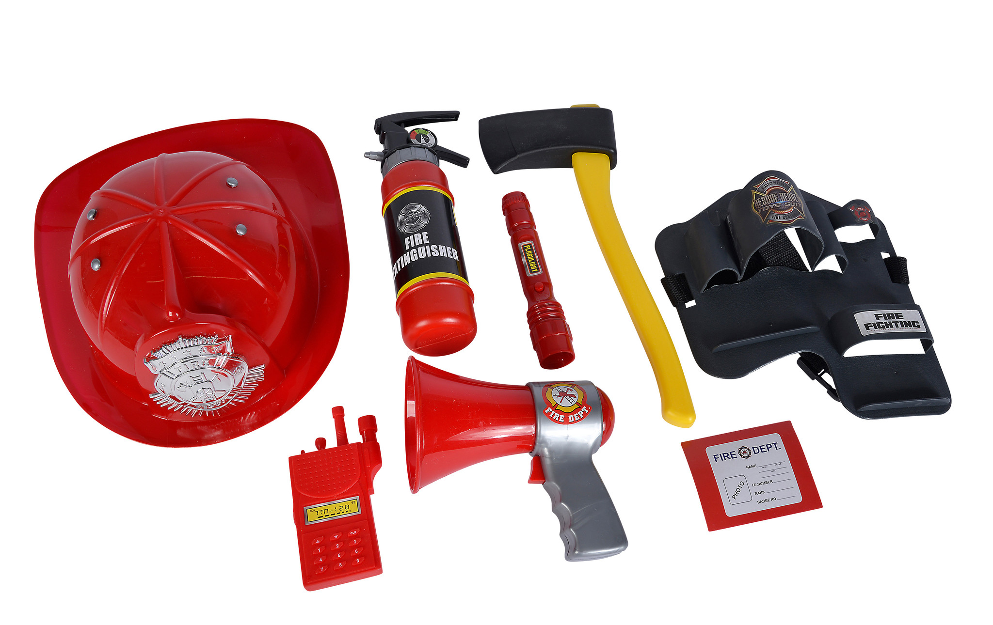 Rolspel Brandbestrijdingsset 8stuks met zaklamp, hoorn, helm, walkietalkie, bijl, brandblusser, ID-KAART, beenholster