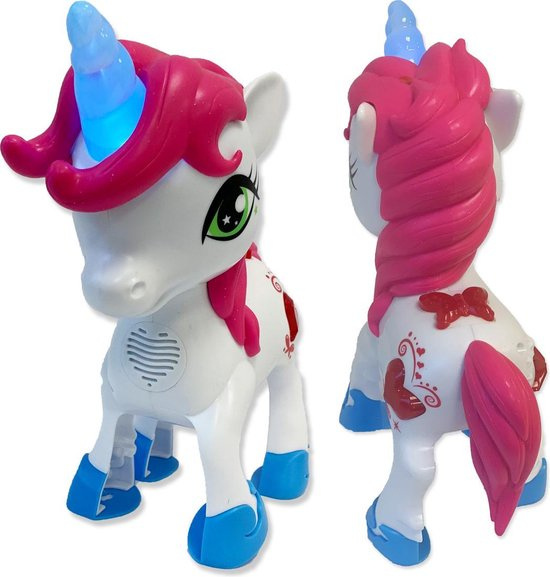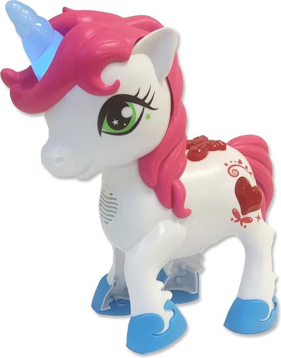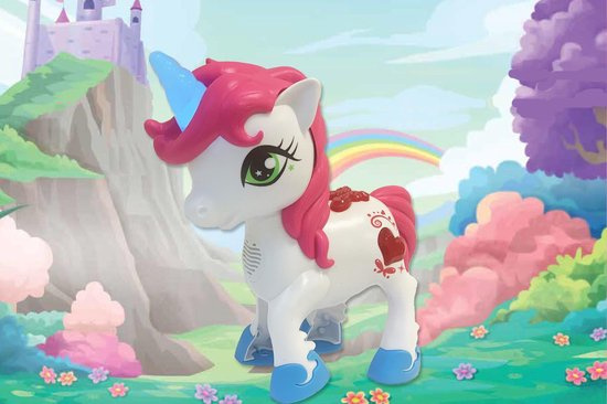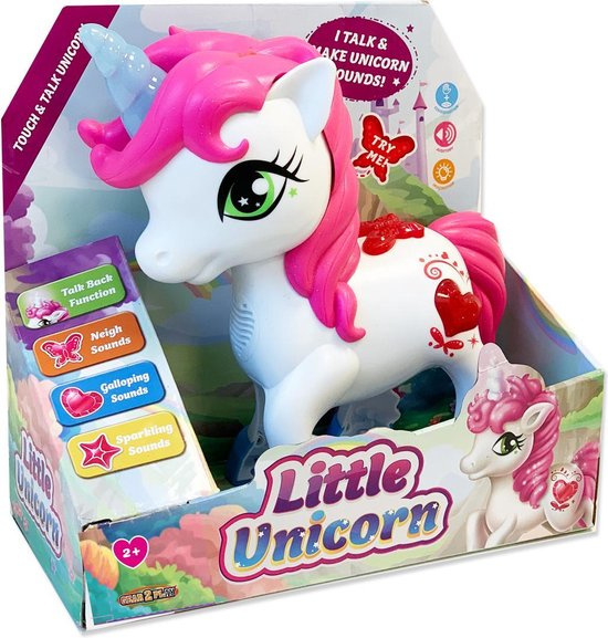 Little Unicorn is een schattige, interactieve Unicorn voorzien van verschillende sensoren, waardoor ze zal reageren op aanraking. Druk op de eenhoorn en spreek je eigen teksten in. Little Unicorn zal de teksten voor jou herhalen. Ook maakt ze hinnik en galop geluiden, net als een echte Unicorn! Haar sprankelende eenhoorn licht blauw op als je erop drukt en ze maakt ook een schattige sprinkel, sprankelgeluid. De vrolijke Little Unicorn wil altijd met jou spelen! Afmeting Unicorn: 22 x 11 x 21 cm (lxbxh). Batterij informatie: 3 x AA batterijen (meegeleverd). LET OP: deze dienen voor de TRY ME functie, dus kunnen zwak zijn bij aanschaf. Leeftijdsindicatie: 2 jaar+