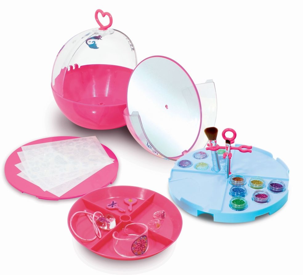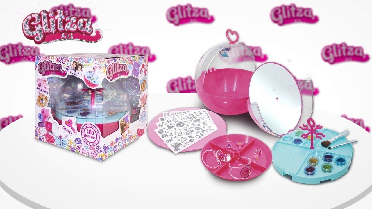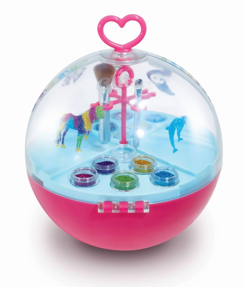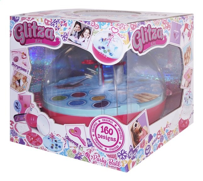 Glitza Party Bal – Breng je Glitza Bal mee om een Glitza-feestje met je vriendinnen te organiseren. Met meer dan 160 Glitza-ontwerpen en een oneindig aantal glittercombinaties versier je je accessoires, maak je glitterjuwelen zoals armbanden, ringen,…, kan je je nagels doen en je Party Bal personaliseren. Het functionele dienblad bevat een deel waar je de glitterkleuren kan mengen om je eigen kleuren te creëren, twee delen om je glitter op te bergen en een deel waarop je manicures kan doen. Je kan heel gemakkelijk het teveel aan glitter van het manicureblad verzamelen. Onder het dienblad vind je een spiegel waaronder zich een geheim vakje bevindt die alleen maar geopend kan worden met één van de 2 sleuteltjes. Met Glitza schitter je als een ster, verbeter je je creativiteit en beleef je een geweldige tijd met je vriendinnen. Bevat: 160 Glitza ontwerpen 1 borstel om glitter aan te brengen 1 grote borstel om het teveel aan glitter weg te borstelen 4 juwelen om te versieren (1 grote doorzichtige armband, 1 hartvormig hangertje met touwtje, 2 hartvormige ringen) 5 potjes Glitza glitter 1 potje om je gemengde kleuren in te doen 2 sleutels voor het geheim vakje 1 party bal met spiegel, geheim vakje, vak om ontwerpsjablonen te bewaren, functioneel dienblad