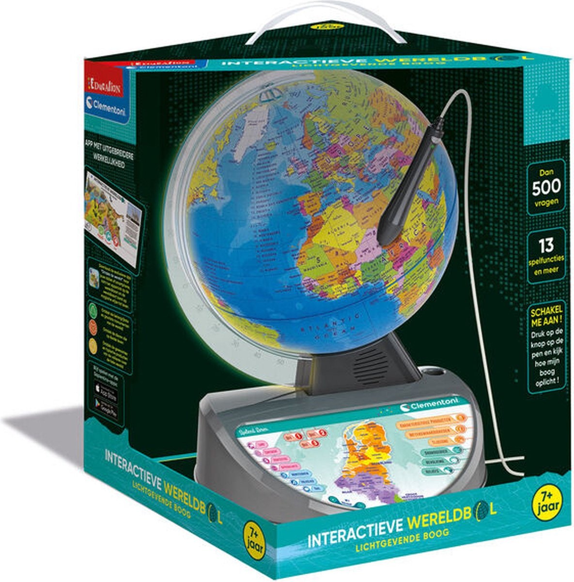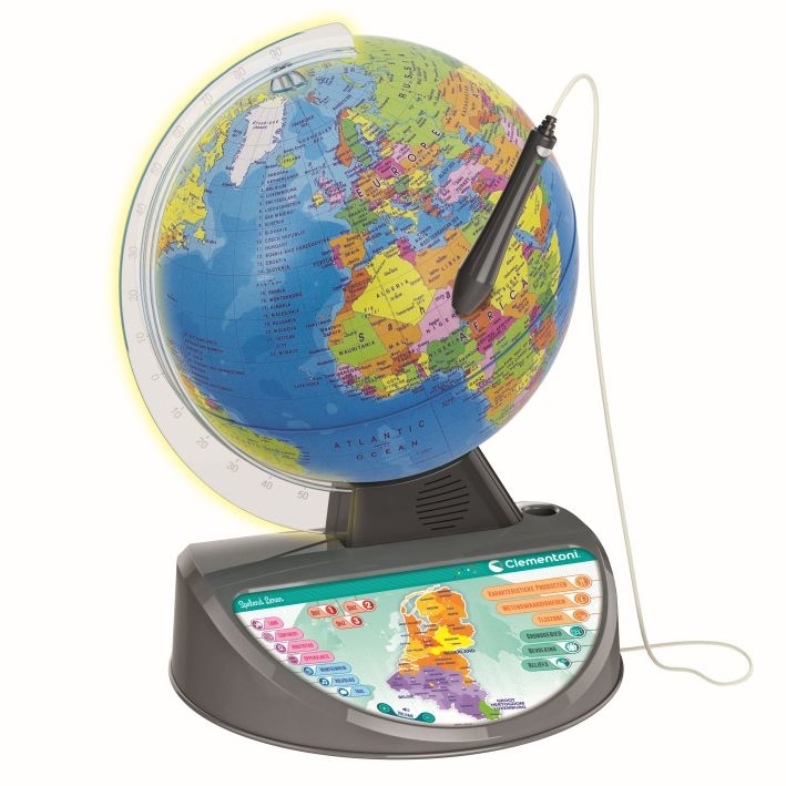 Een geheel nieuw ontwerp voor deze prachtige sprekende interactieve wereldkaart met optische leespen. De transparante boog licht op als de globe aan staat! Kinderen kunnen de wereld ontdekken en leren over continenten, landen, hoofdsteden, oppervlaktegebieden, populaties, valuta’s, talen, gebieden, hoogtes, tijdsverschillen, interessante feiten. Met meer dan 500 vragen verdeeld over 3 verschillende moeilijkheidsgraden om verworven kennis te testen. Leren zal boeiend zijn dankzij het nieuwe ontwerp, superieure audiokwaliteit en meer dan drie uur aan informatieve audio-inhoud, interessante feiten en muziek van over de hele wereld. Met de nieuwe app die beschikbaar is om te downloaden, kunnen kinderen een verhoogde realiteitservaring beleven. Wanneer de wereldkaart wordt ingelijst met een tablet of smartphone, kan het kind dieren, monumenten en verschillende culturen zien.