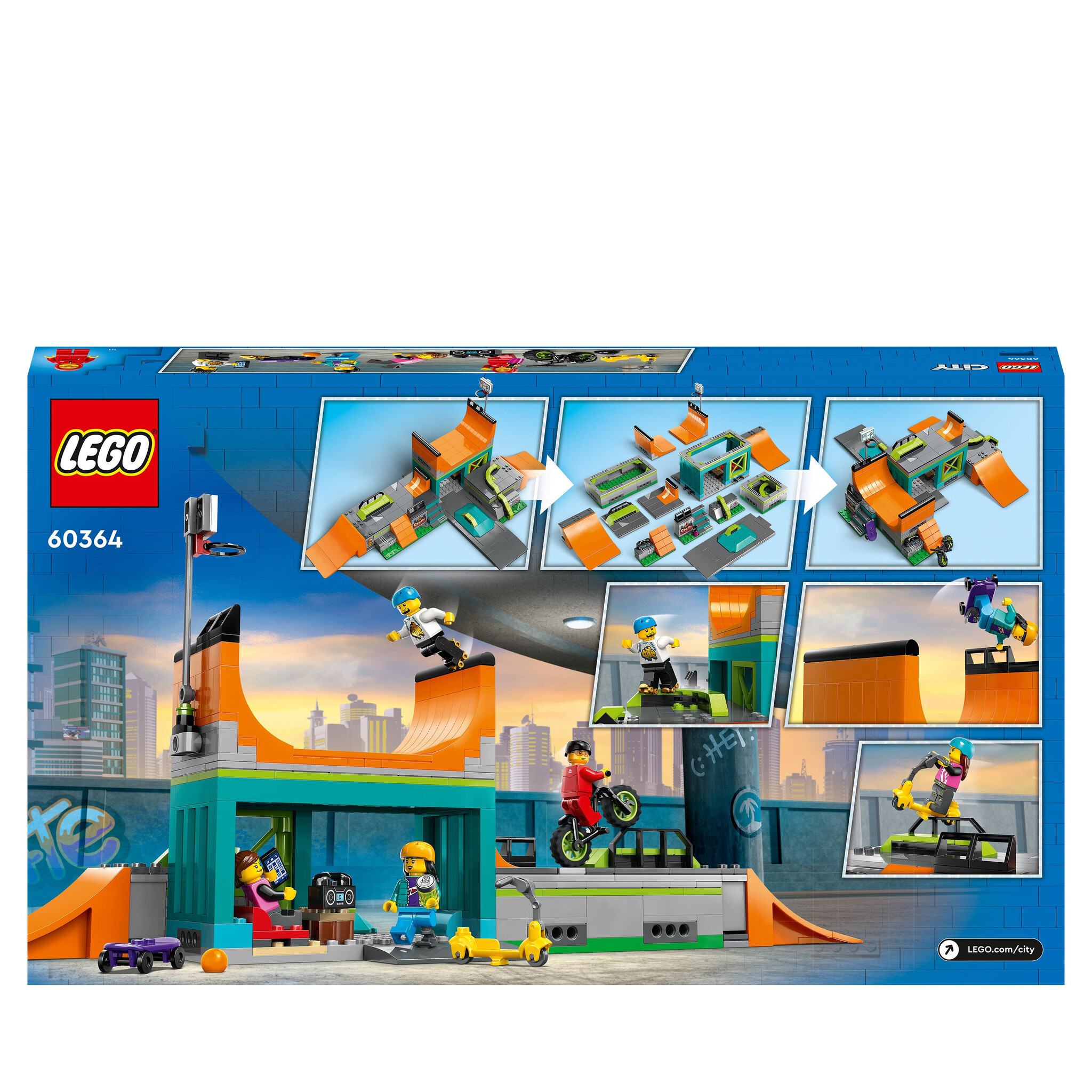 Kinderen en skatefans zullen dol zijn op deze LEGO City Skatepark set (60364). Deze set zit vol inspiratie voor fantasierijk spel en bevat modulaire hellingen om het skatepark op verschillende manieren in te delen. Er is ook een speelgoed fiets, een skateboard, een step, rolschaatsen, 4 skater mini figuren en een LEGO wegplaat om het model te combineren met andere LEGO City sets.De set is inclusief eenvoudig te volgen gedrukte bouwinstructies plus digitale instructies in de LEGO Builder app. Met deze intuïtieve bouwgids kunnen kinderen tijdens het bouwen inzoomen, modellen draaien en ze vanuit alle hoeken bekijken. In de app kunnen ze ook hun bouwvoortgang bijhouden en virtuele speelsets ontdekken en opslaan.LEGO City speelsets bevatten gebouwen boordevol functies, realistische voertuigen en leuke personages die fantasierijke rollenspellen op basis van helden en situaties uit het echte leven stimuleren. Deze speelgoed set is een geweldig verjaardagscadeau voor kinderen vanaf 6 jaar.Afmetingen: in de basisopstelling is de skatepark set ca. 19 cm hoog, 44 cm breed en 25 cm diep.Bevat 454 onderdelen.