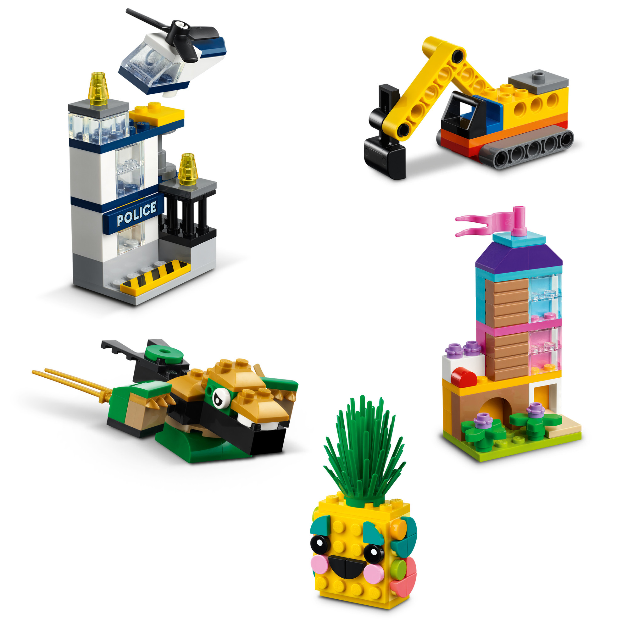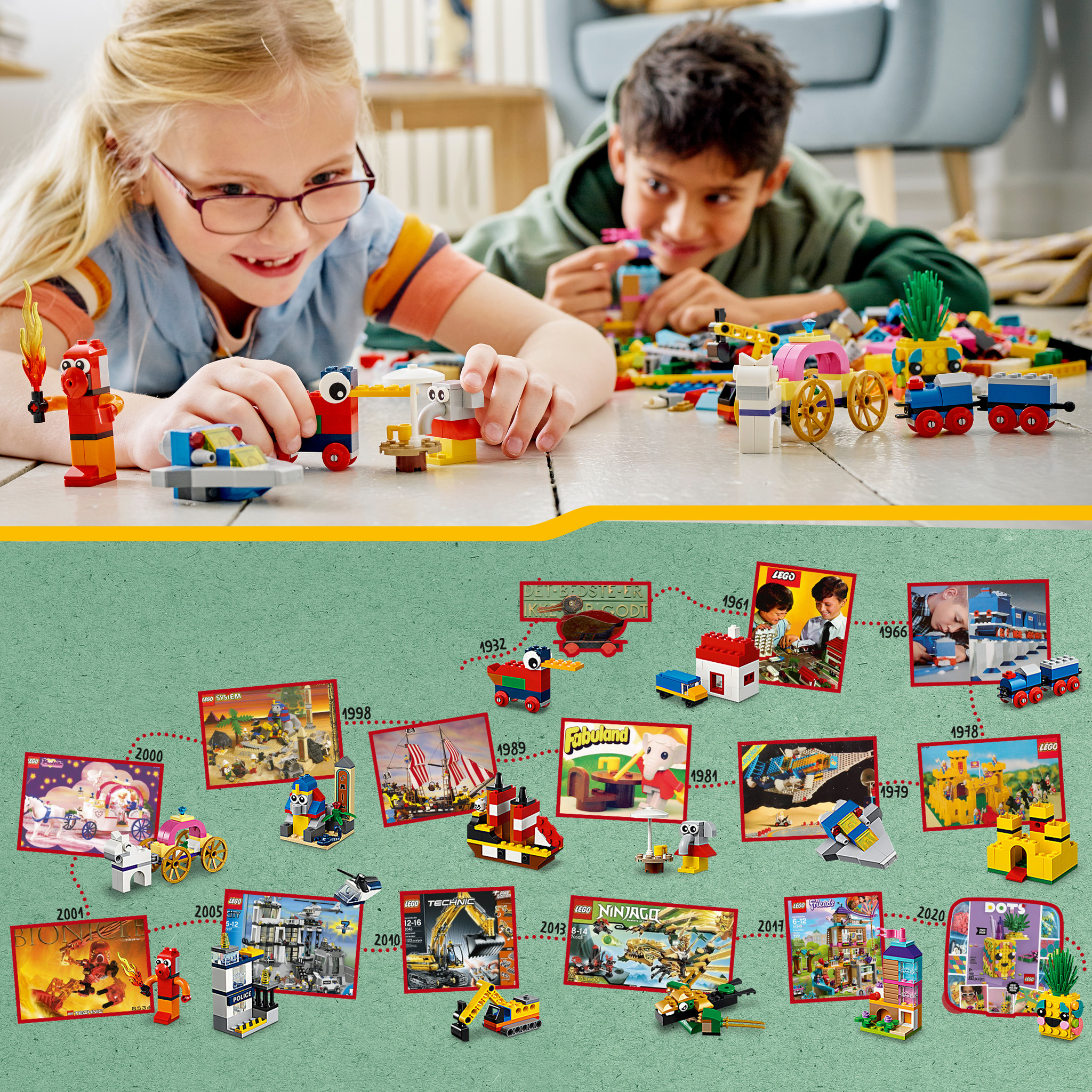 Met deze LEGO Classic 90 jaar spelen (11021) bouwset kunnen kinderen, volwassenen en grootouders genieten van eindeloos speelplezier en nostalgie. Deze set, een eerbetoon aan een lange geschiedenis van creatief speelgoed, bevat een regenboog aan kleurrijke LEGO onderdelen, 15 minimodelversies van iconisch LEGO constructie speelgoed door de jaren heen, plus extra stenen om zelf wat mee te bouwen!In de doos zitten minimodellen van een kasteel, een trein, een eend en nog veel meer leuke objecten uit de LEGO collectie. Elk van de 15 minimodellen beschikt over een eenvoudige stapsgewijze bouwgids met afbeeldingen, zodat zelfs beginnende bouwers hun LEGO speelgoed helemaal zelf kunnen bouwen.LEGO Classic bouwpakketten geven kinderen ideeën en inspiratie, waarbij ze creatieve vaardigheden ontwikkelen die een leven lang meegaan. Deze LEGO classic speelset voor kinderen vanaf 5 jaar is een ideaal cadeau voor een verjaardag, feestdag of speciale gelegenheid voor LEGO bouwers van alle leeftijden.Bevat 1100 onderdelen