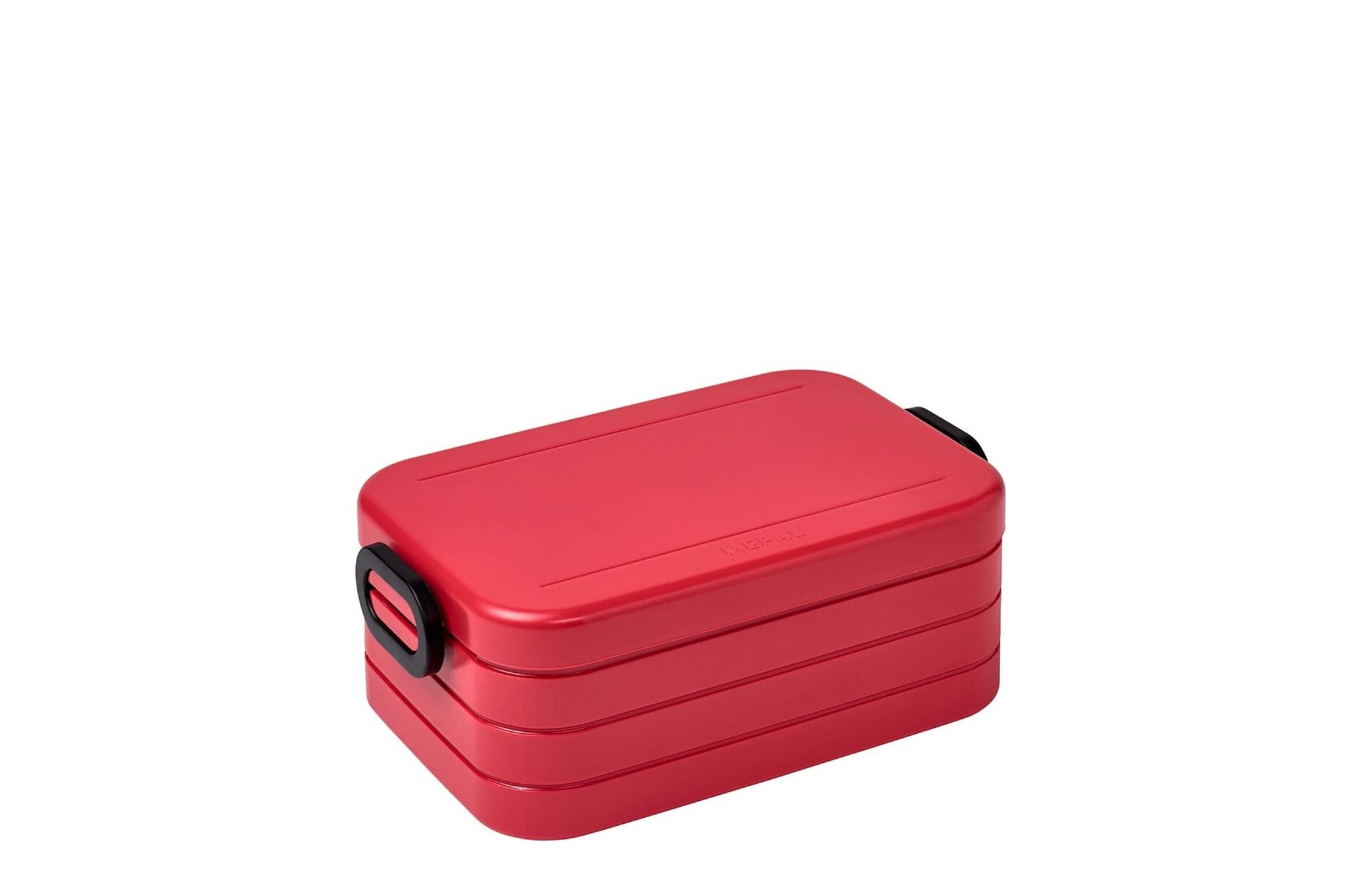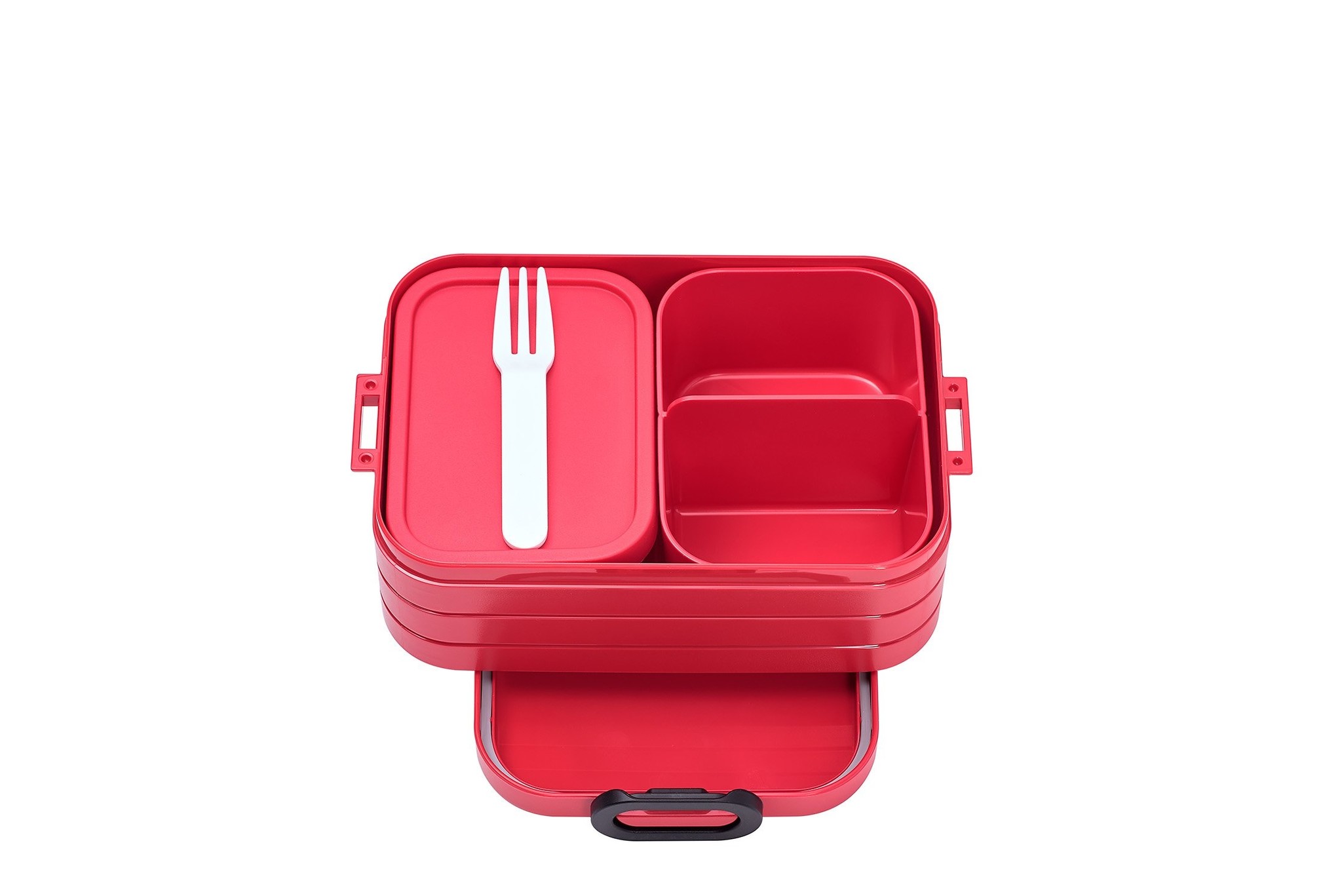 Bento lunchbox Take a Break midi in de kleur Nordic red. Inclusief bento boxjes. Nog restjes over van gisteren? Neem ze gerust mee onderweg. Met twee aparte vakken, plus een extra box met vorkje, houdt de Bento in jouw lunchbox je (hartige) lunch altijd heerlijk vers! Combineer er op los, en bepaal zelf wat je eet en wanneer. De lunchbox met Bento is robuust en herkenbaar eigenwijs van vorm. De bentobakjes in de lunchbox mogen (zonder deksel) in de magnetron. Perfect voor het combineren van verschillende kleine gerechtjes. Dus geniet met volle teugen!