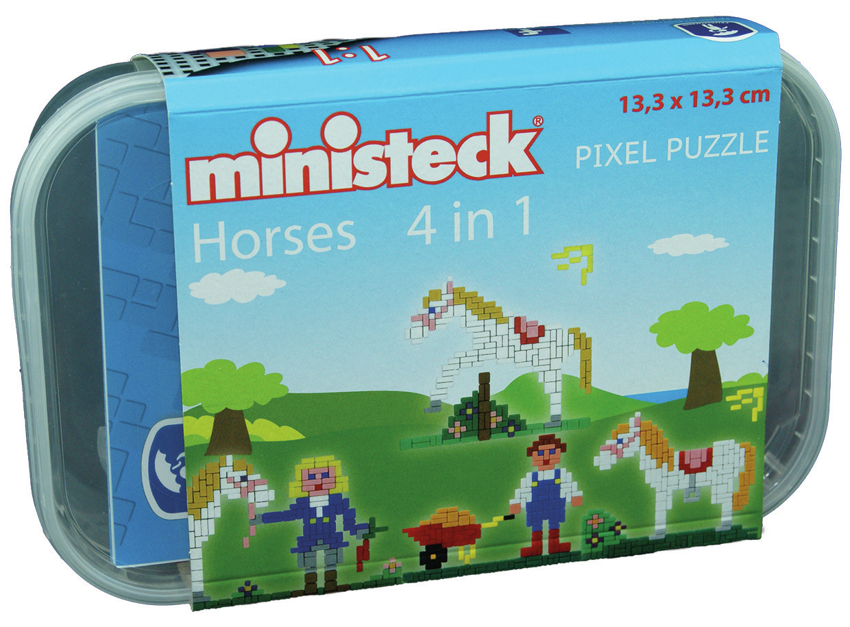 Ministeck Horsestable – Plastic Box – 500pcs Afmeting grondplaat: 13,3 x 13,3cm Ministeck voorziet al sinds 1950 jong en oud van creatief vermaak. Met keer op keer nieuwe sjablonen kan je jezelf telkens weer uitdagen met een nieuw ontwerp. Of je nu beginner bent of een meesterwerk van meer dan 30.000 stukjes op het bord legt, met het uitgebreide assortiment is er altijd een ontwerp die je past. Druk de pinnetjes op de juiste plaats en zie beetje bij beetje de afbeelding tot leven komen. Volg de bestaande ontwerpen of laat je fantasie het werk doen.