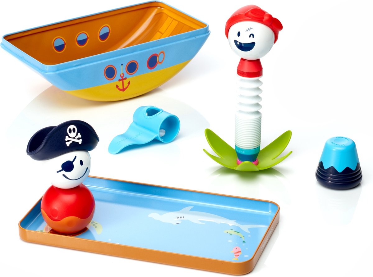 Schip ahoy kleine maatjes! Alle trossen los voor een echt piratenfeest! Wiebel mee aan dek van het piratenschip of ga op schattenjacht op een verlaten eiland. De metalen speeldoos dubbelt als speelterrein en als opbergdoos voor je onderdelen. Ontdek de