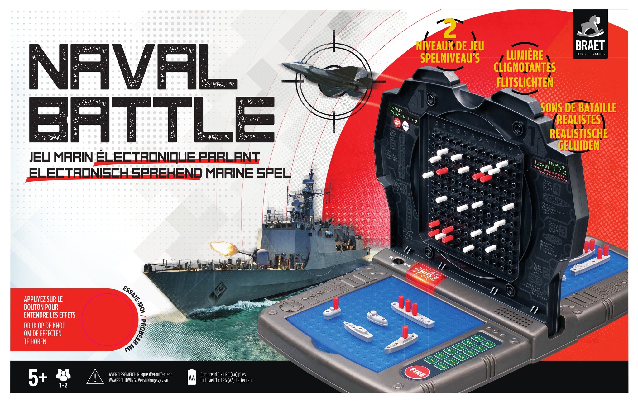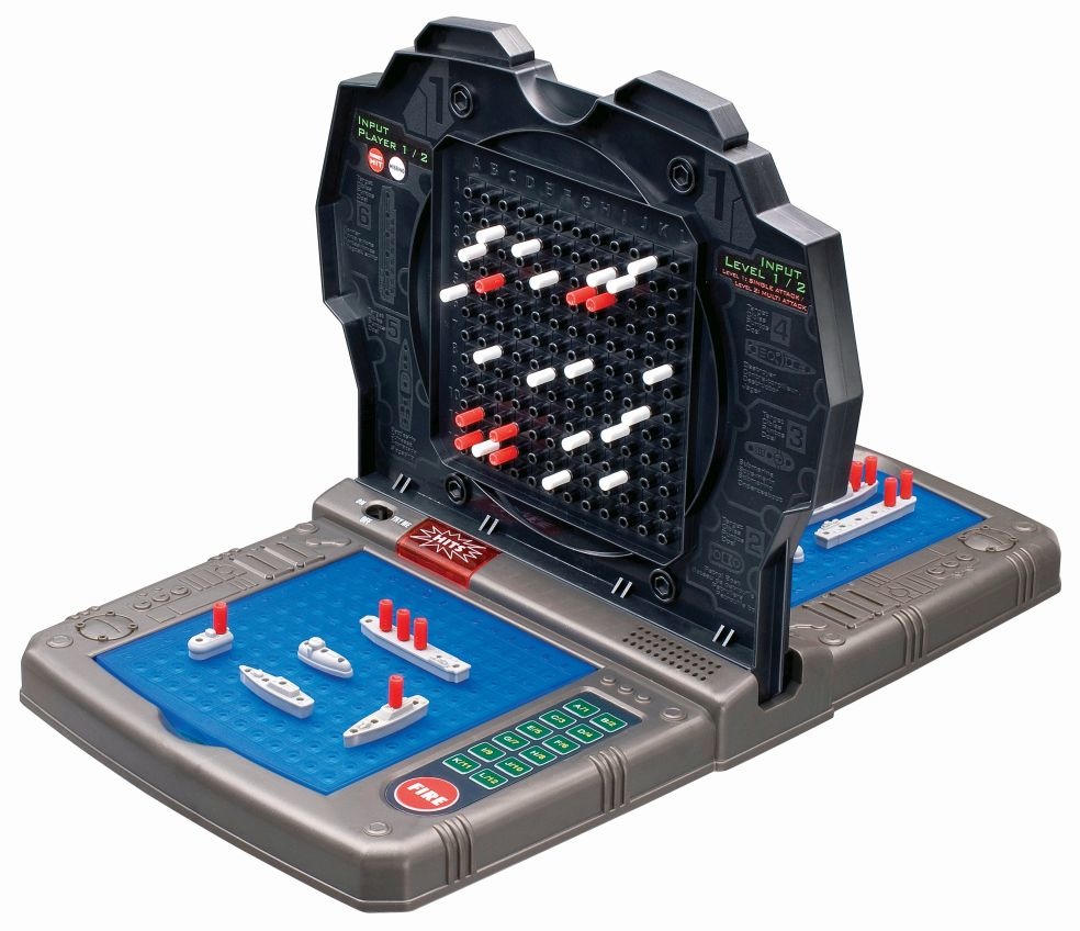 De elektronische versie van het klassieke zeegevecht spel. Met 2 spelniveau’s: basis of ervaring (met snelvuur modus). Je kan alleen spelen (tegen de computer) of met z’n 2 (tegen elkaar). Met licht- & geluidseffecten alsof je middenin het zeegevec