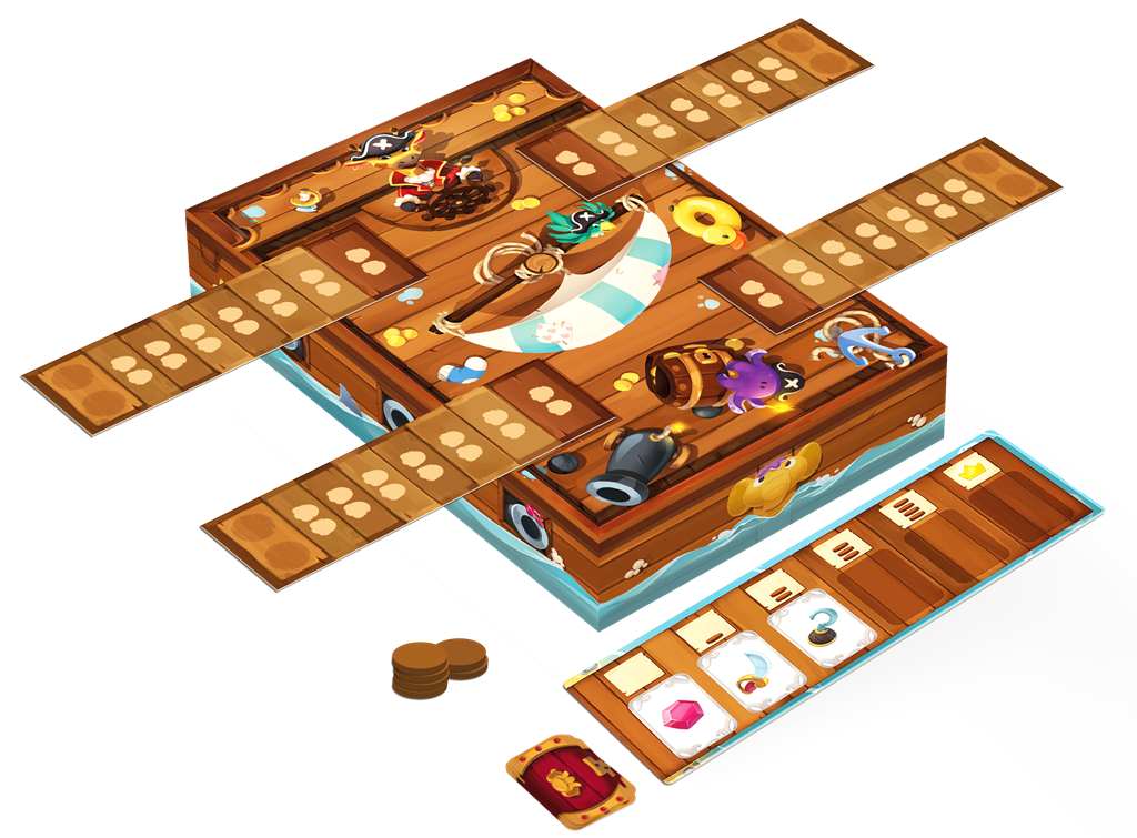 Elke speler kiest een olifant en plaatst deze op één van de 4 magneetborden. De schatkaarten worden geschud. Tijdens zijn/ haar beurt onthult de actieve speler de bovenste kaart van de trekstapel en legt deze op het eerste beschikbare veld van het pont