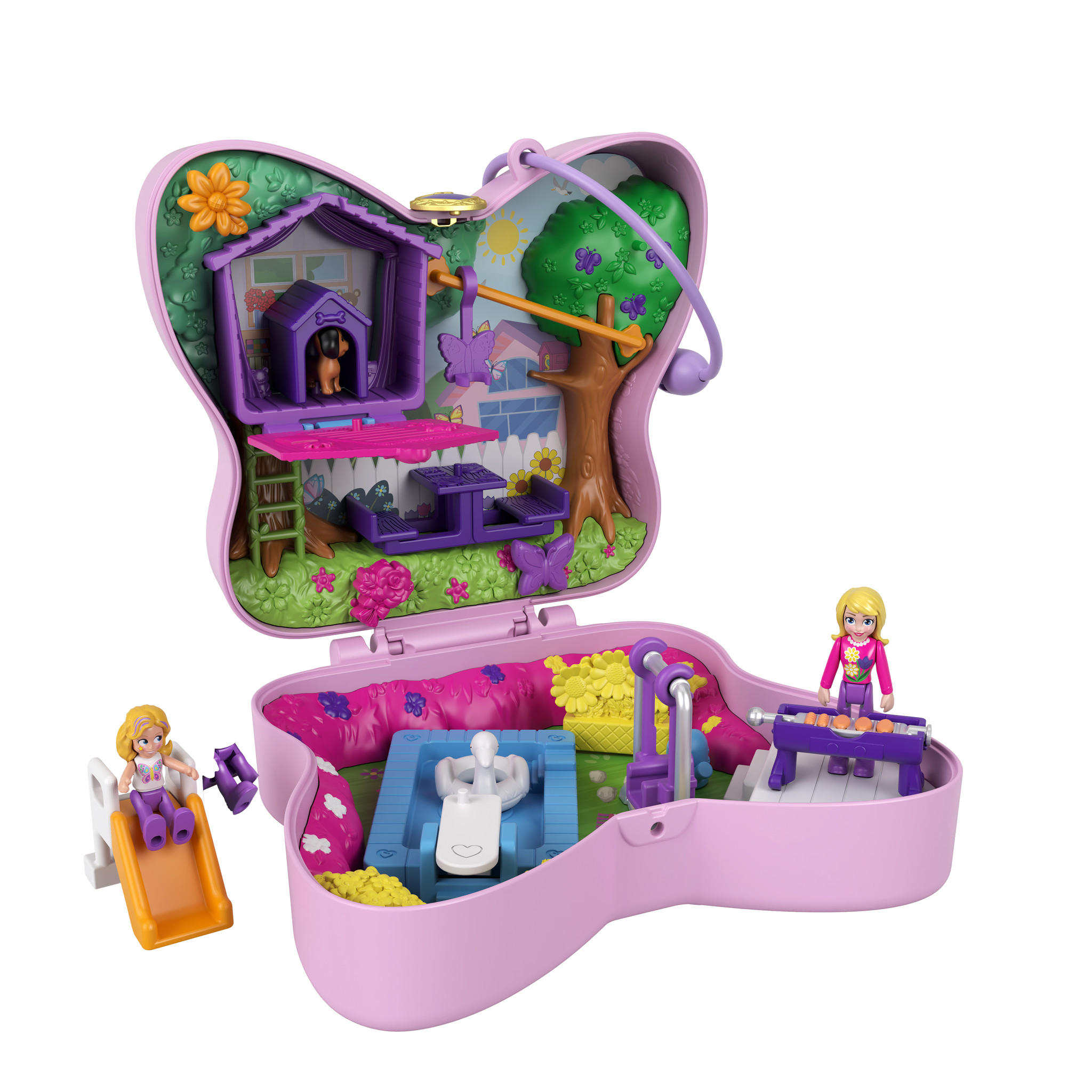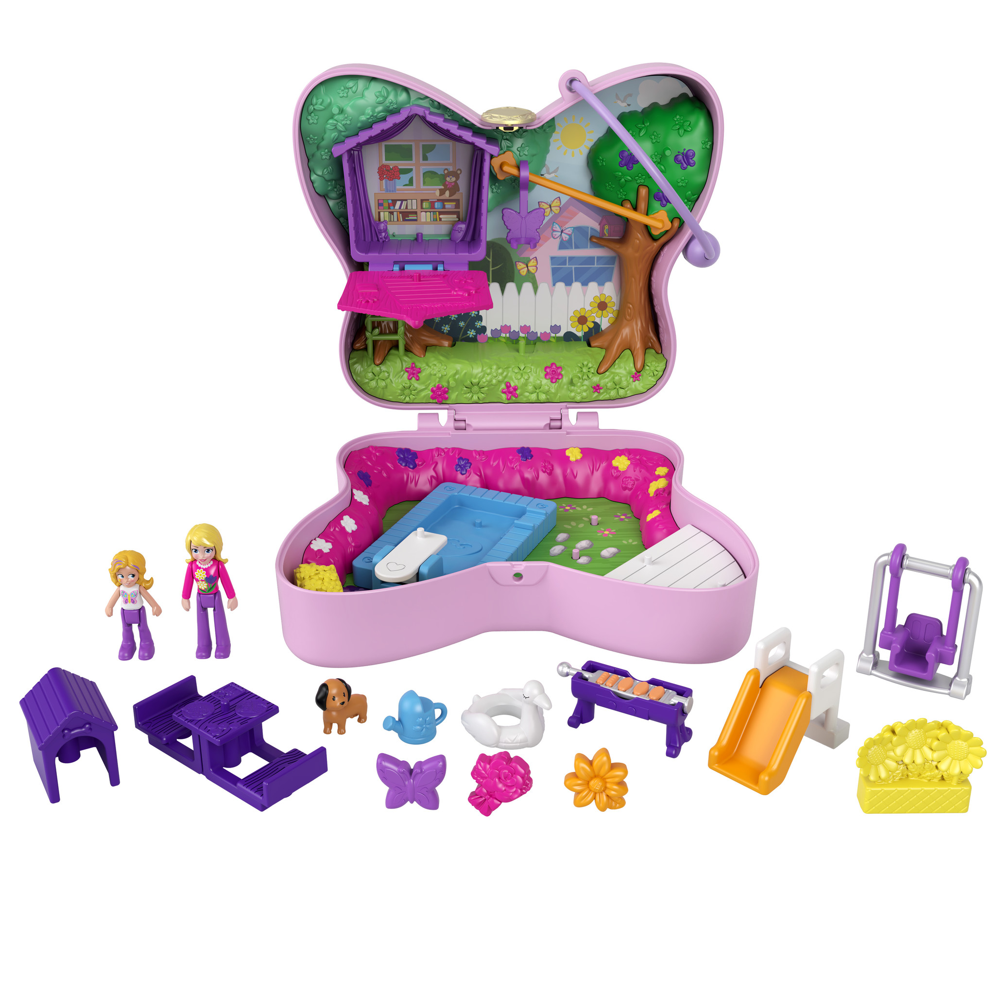 Bereid je voor op pret in de achtertuin met Polly Pocket! Met deze Vlindertuin compact in de vorm van een schattige vlinder beleef je zowel thuis als onderweg eindeloos speelplezier. In het midden van de vlinder zitten glitters! Open de compacte speelkoffer en geniet van de spannendste outdooravonturen, samen met de micropoppen van Polly en de moeder van Polly (beide met 5 beweegbare gewrichten), 5 leuke verrassingen en 13 accessoires! Bedenk de leukste verhalen wanneer je de deur van de boomhut openmaakt, via het vlindertouw van de ene naar de andere kant zoeft, op de schommel schommelt, eten bereidt op de barbecue en van de duikplank in het zwembad springt! Sommige accessoires hebben een Plop en Ruil pinnetje, zodat kinderen ze op verschillende speelplekken kunnen zetten voor eindeloze speelmogelijkheden! De compacte speelkoffer heeft ook een handvat dat je om je pols kunt doen, zodat je overal en altijd op avontuur kunt gaan met Polly Pocket! Afwijkende kleuren en versieringen mogelijk. Een fantastisch cadeau voor kinderen vanaf 4 jaar.