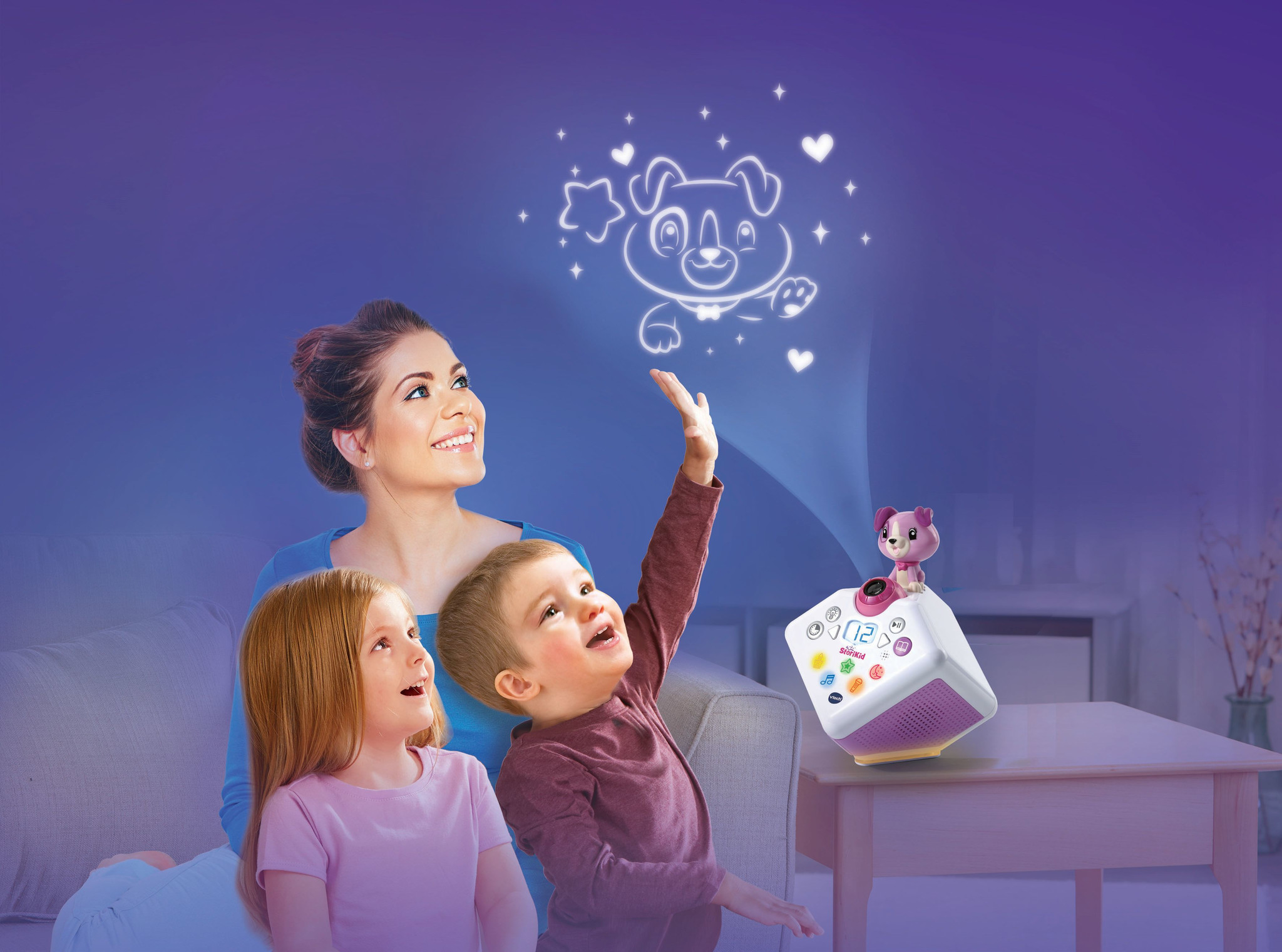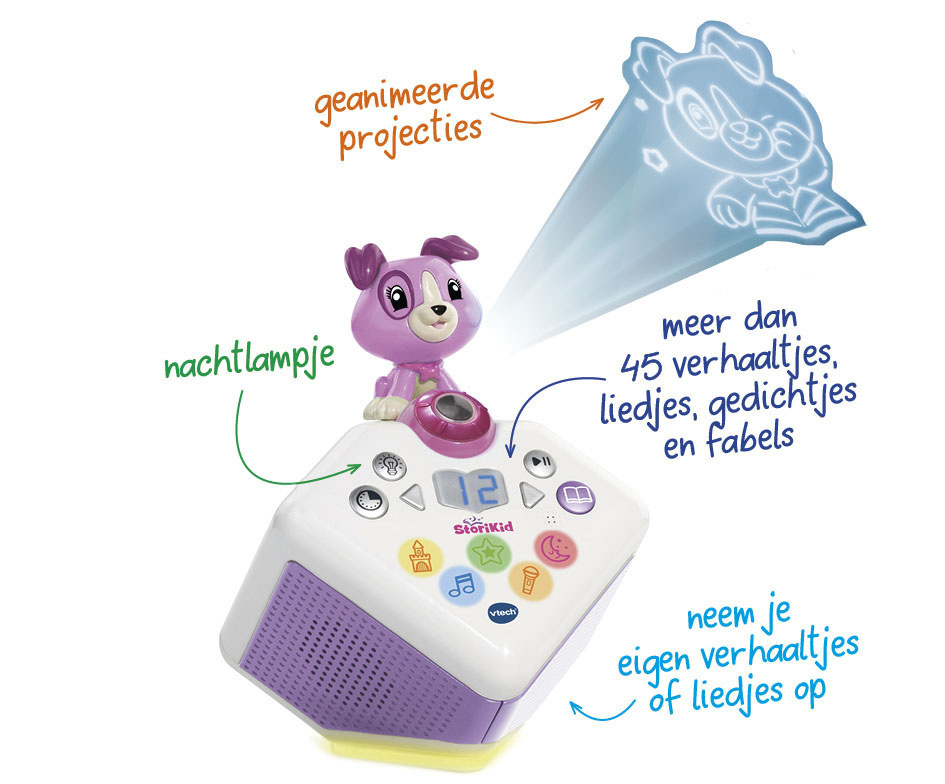 Kijk naar de projecties en luister naar bekende sprookjes, mythes, legendes en fabels. Val heerlijk in slaap tijdens de rustgevende bedtijdverhaaltjes of zing mee met de vrolijke kinderliedjes. Druk op de puppy om vrolijke grapjes en interessante weetjes te horen of geniet van een zelf opgenomen verhaaltje van papa of mama! Sluit de StoriKid aan op een computer om nog meer content te downloaden.
