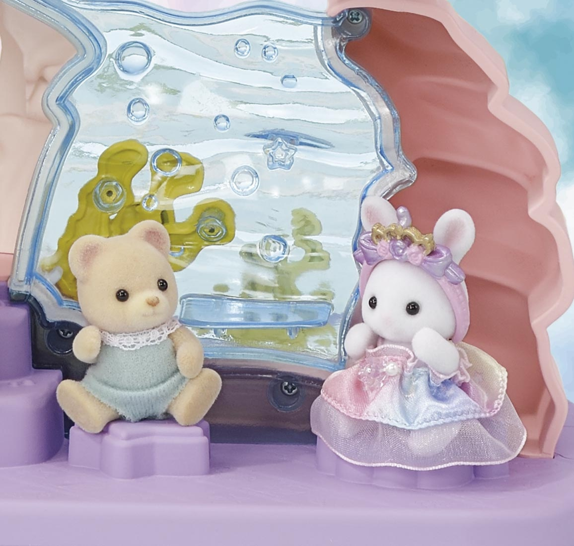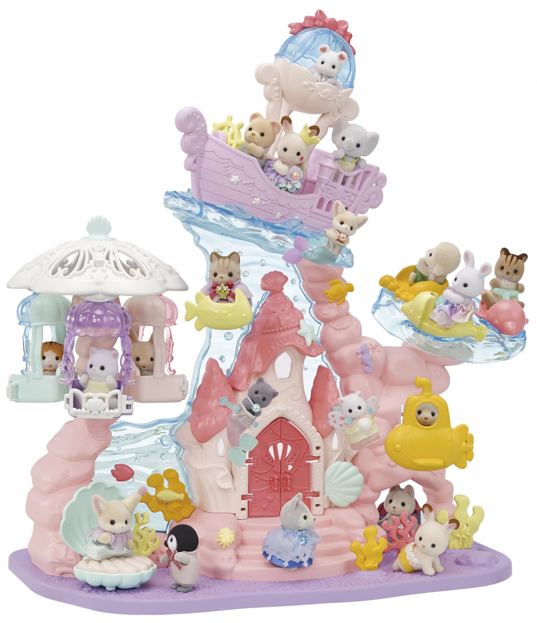 Baby zeemeermin kasteel met drie baby figuren. Deze speelset bevat een prachtig zeemeermin kasteel , Aqua- go – round rit, Jelly fish schommels en nog veel meer voor baby figuren om in te rijden/wiegen! De baby’s dragen allemaal speciale outfits met ee