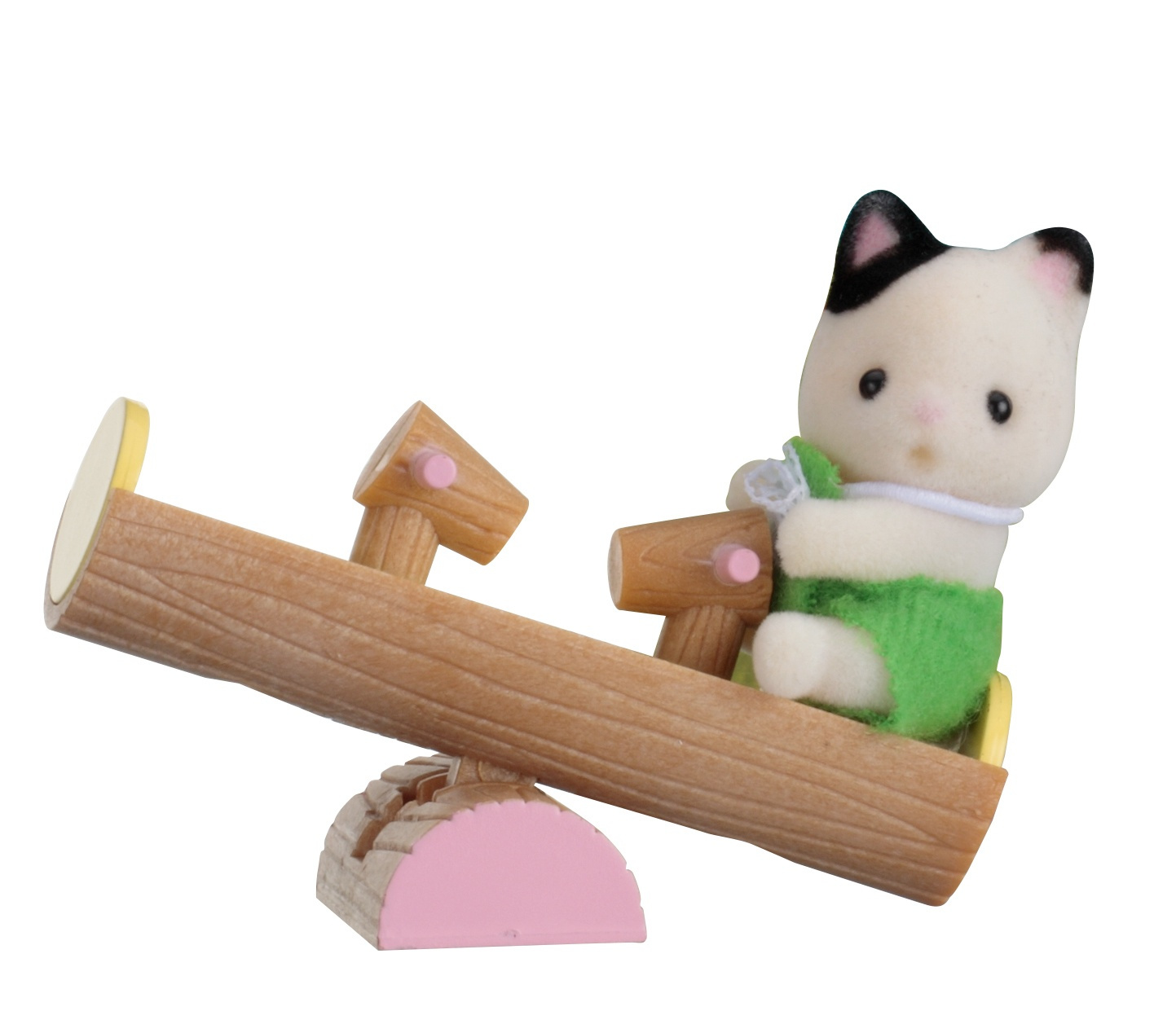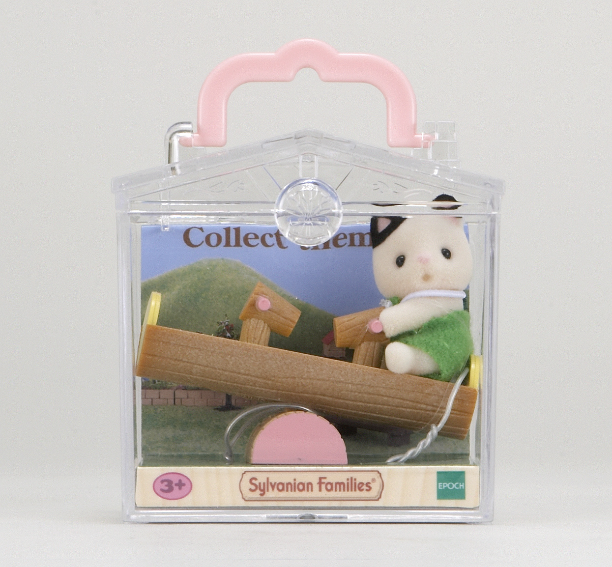 Deze lieve baby Tuxedo Kat heeft een eigen wip waar de hele dag op gespeeld kan worden. Dit kleintje heeft een roomkleurige vacht en zwarte oren en staat te springen om met de andere katjes en konijntjes op de crèche te spelen! Dit katje en de wip zitten in een draagbox met op de achtergrond het weelderige platteland van Sylvanian Village! Maak je Sylvanian speeltuin compleet met deze leuke speelset en figuur!