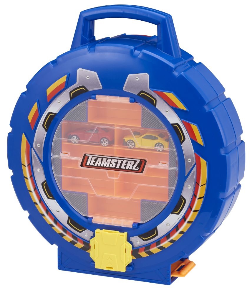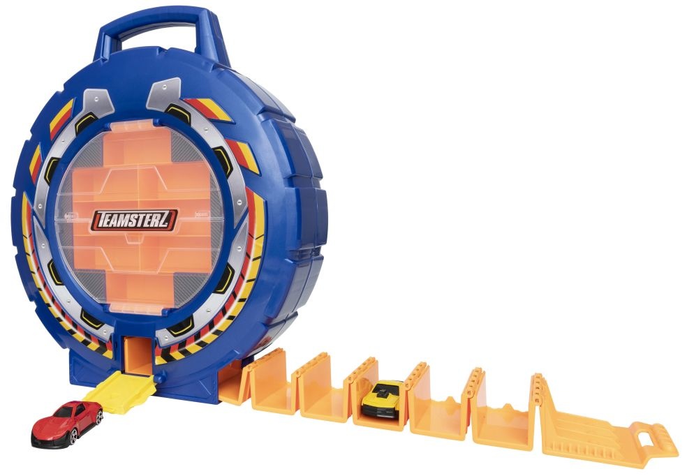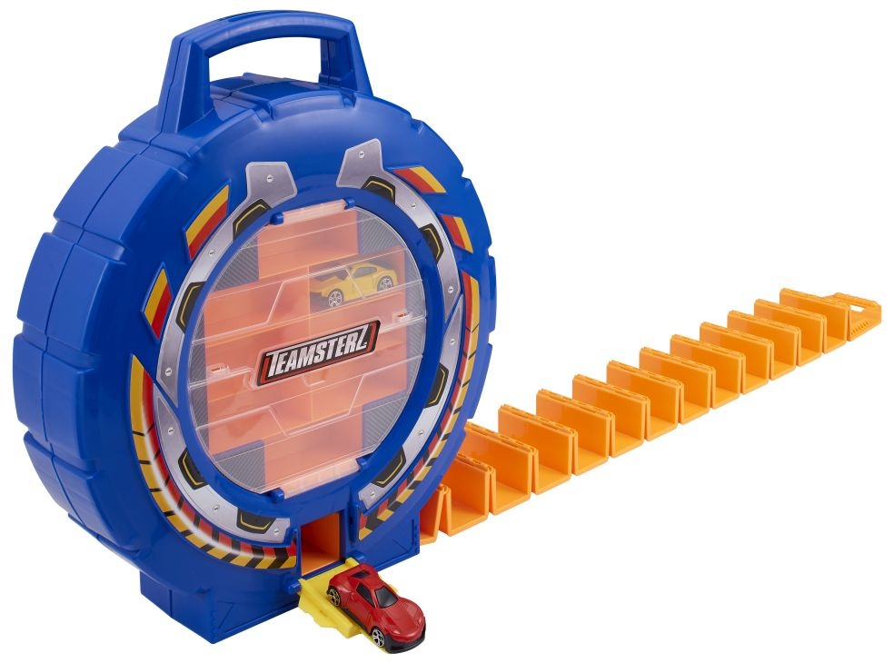 Deze wielvormige draagtas die plaats biedt aan 23 auto’s, doet ook dienst als autolanceerder! Draai aan het tandwiel om het unieke autolaadmagazijn te onthullen, laad tot 15 auto’s, trek de deur naar beneden en druk op de lanceerknop en schiet alle aut