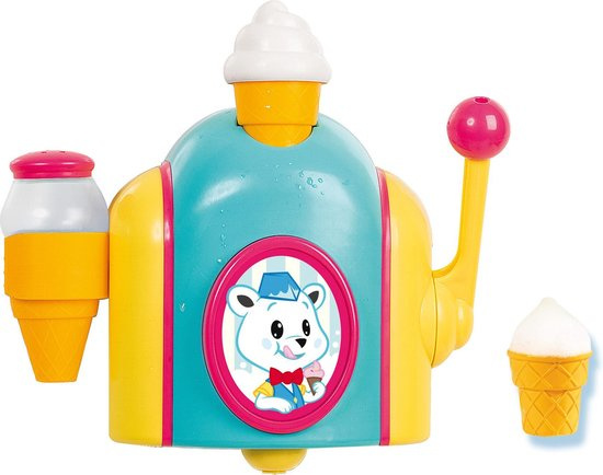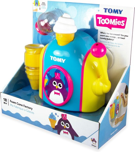 Maak de lekkerste ijsjes met de Schuimijsjes Fabriek van TOMY Toomies. Bevestig de Schuimijsjes Fabriek met de zuignappen aan de rand van het bad of aan badkamertegels. Vul het apparaat met badschuim, houd het ijshoorntje onder het apparaat, trek aan de hendel en er komt een luchtige schuimtoef op het ijshoorntje! Houd je van spikkels? Dan kun je met de speelgoedstrooier de spikkels over het ijs ‘strooien’. In bad gaan wordt nu nog leuker! Leeftijdsindicatie: 18 maanden+.