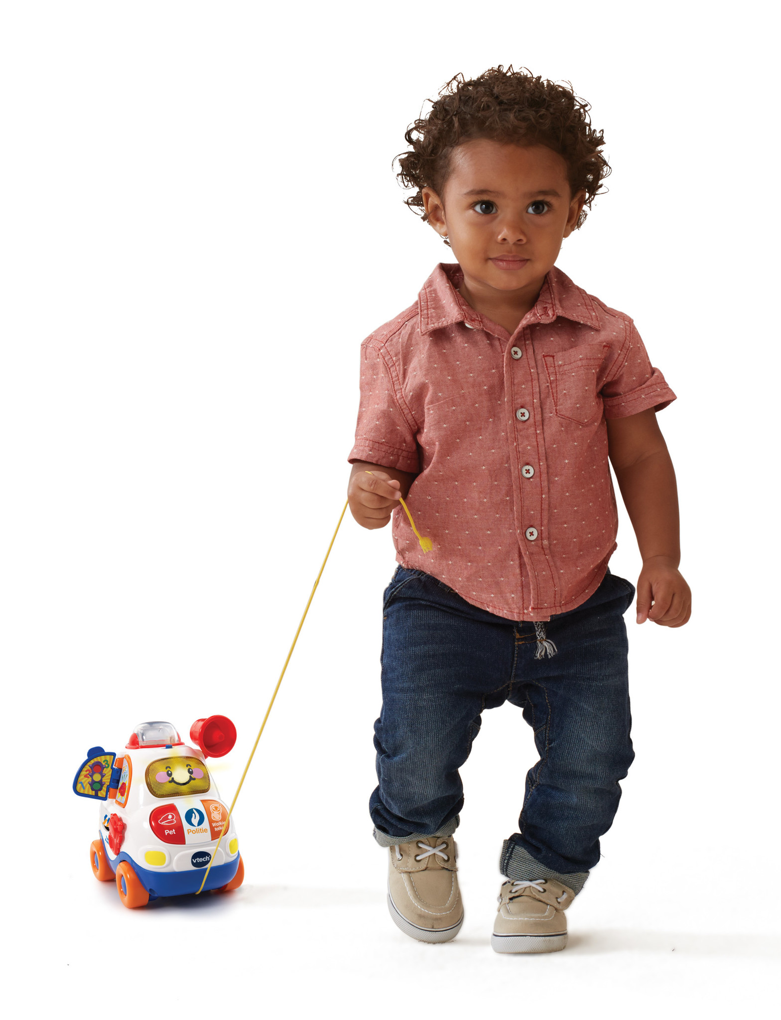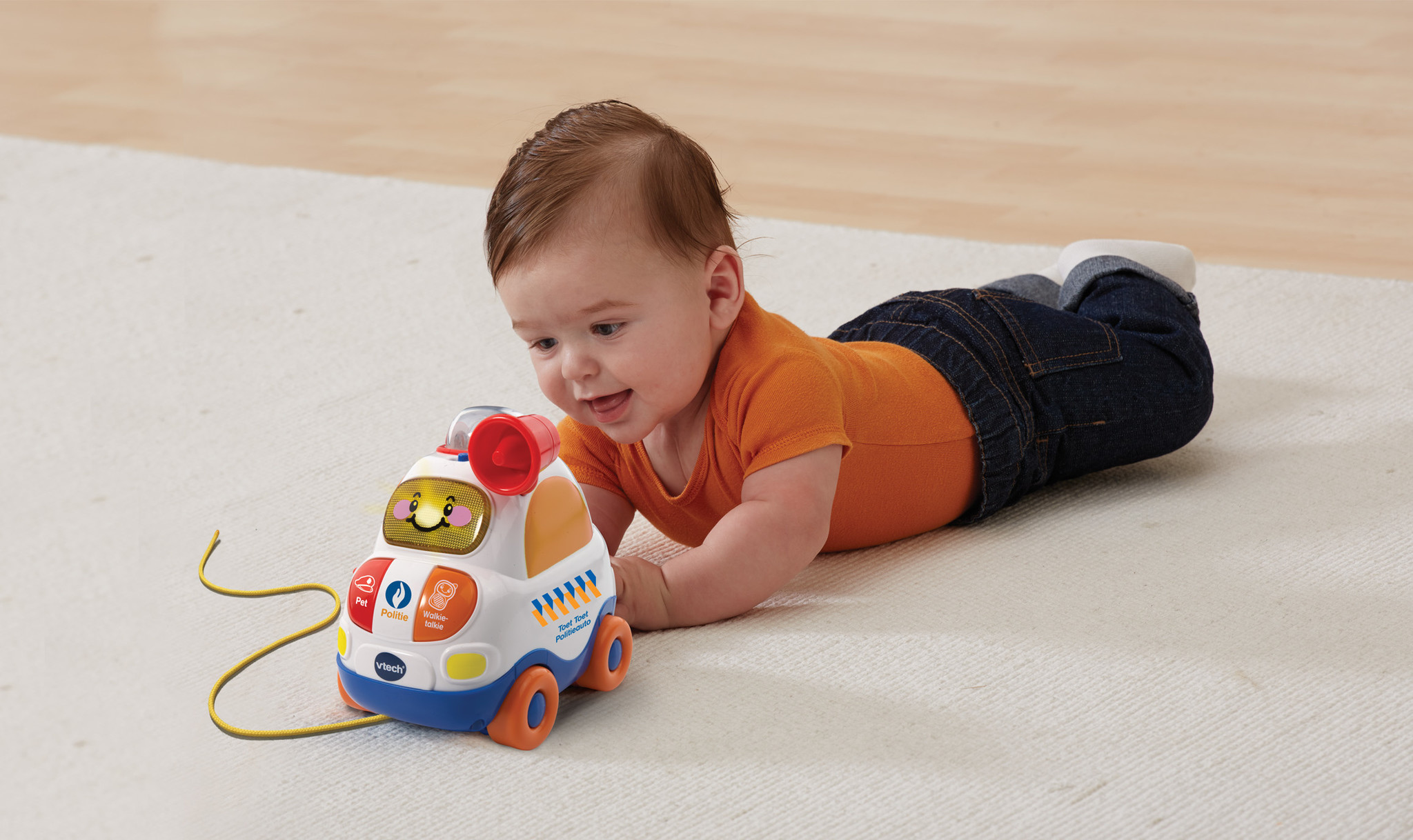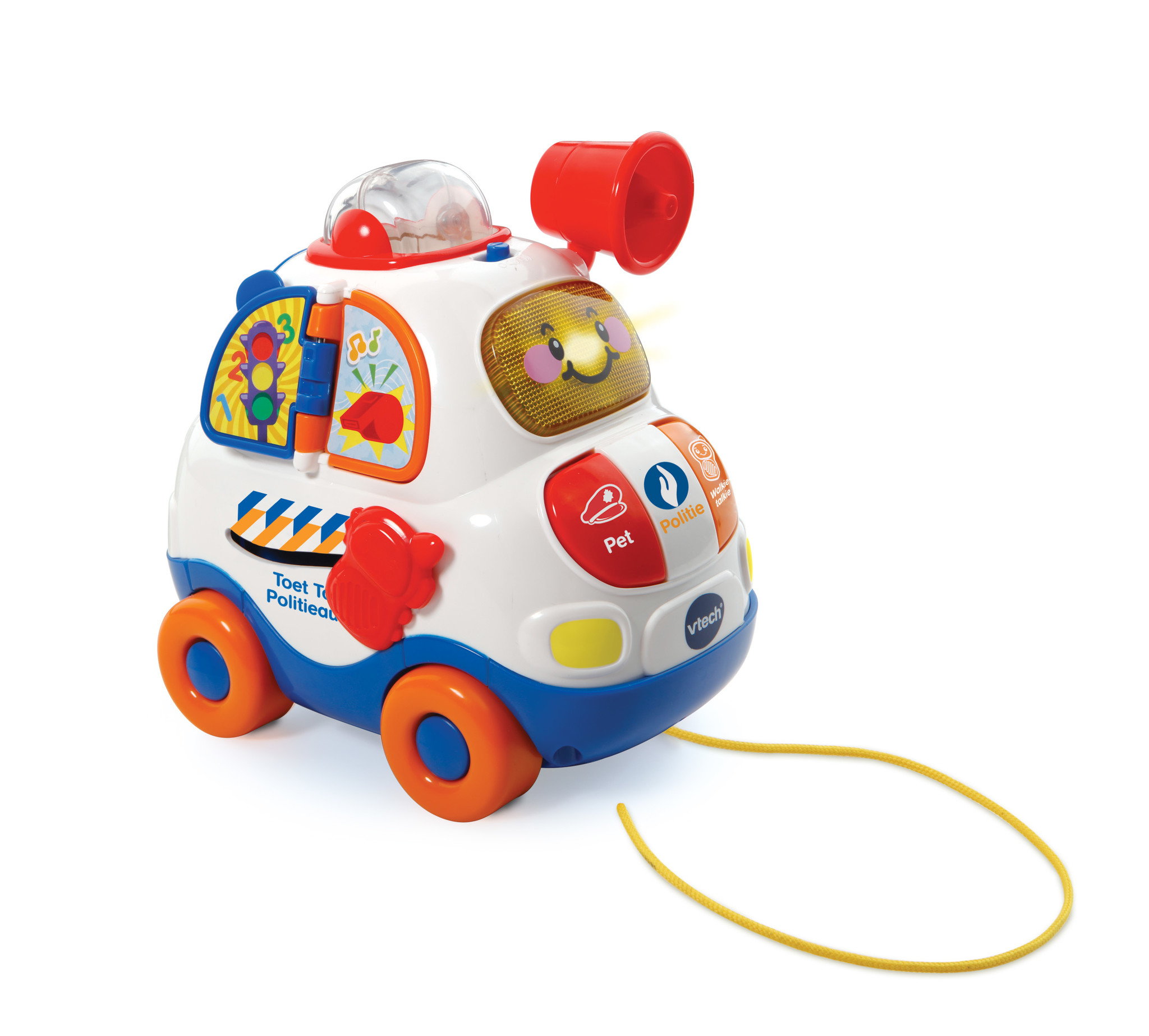 Ga op verkenning en vang de boef! Druk op de toetsen om kennis te maken met kleuren en voorwerpen. Druk op de gezichttoets, klap het raamklepje om en luister naar grappige geluiden en vrolijke zinnetjes. Beweeg de megafoon om stoere geluidseffecten te horen en gebruik het trekkoord om deze dappere politieauto overal mee naartoe te nemen. – Ga op verkenning en vang de boef! – Druk op de toetsen om kennis te maken met kleuren en voorwerpen – Druk op de gezichttoets, klap het raamklepje om en luister naar grappige geluiden en vrolijke zinnetjes – Beweeg de megafoon om stoere geluidseffecten te horen – Gebruik het trekkoord om deze dappere politieauto overal mee naartoe te nemen – 20 melodietjes en 4 gezongen liedjes – Stevig en duurzaam design – Regelbaar volume – Automatische uitschakeling