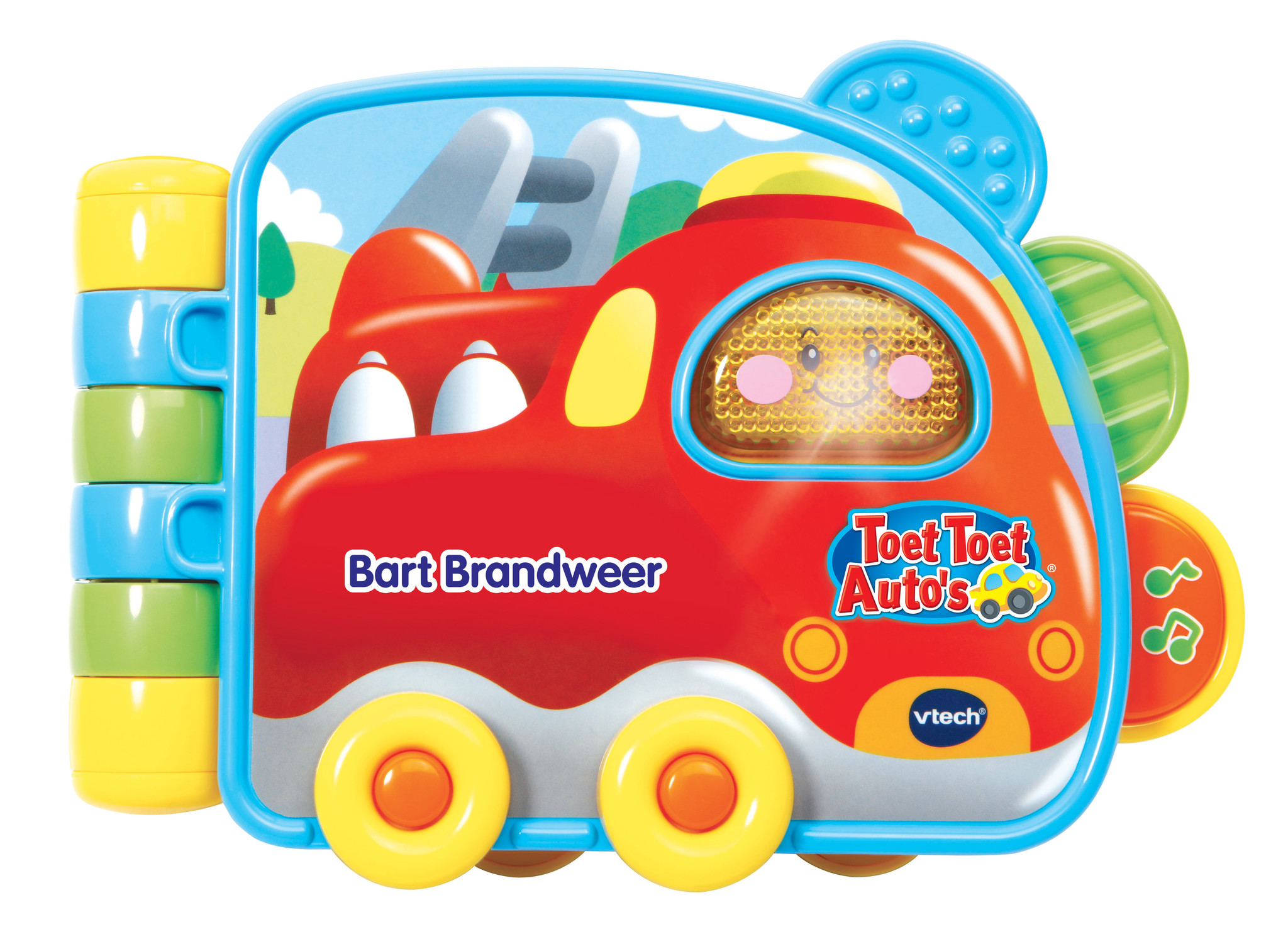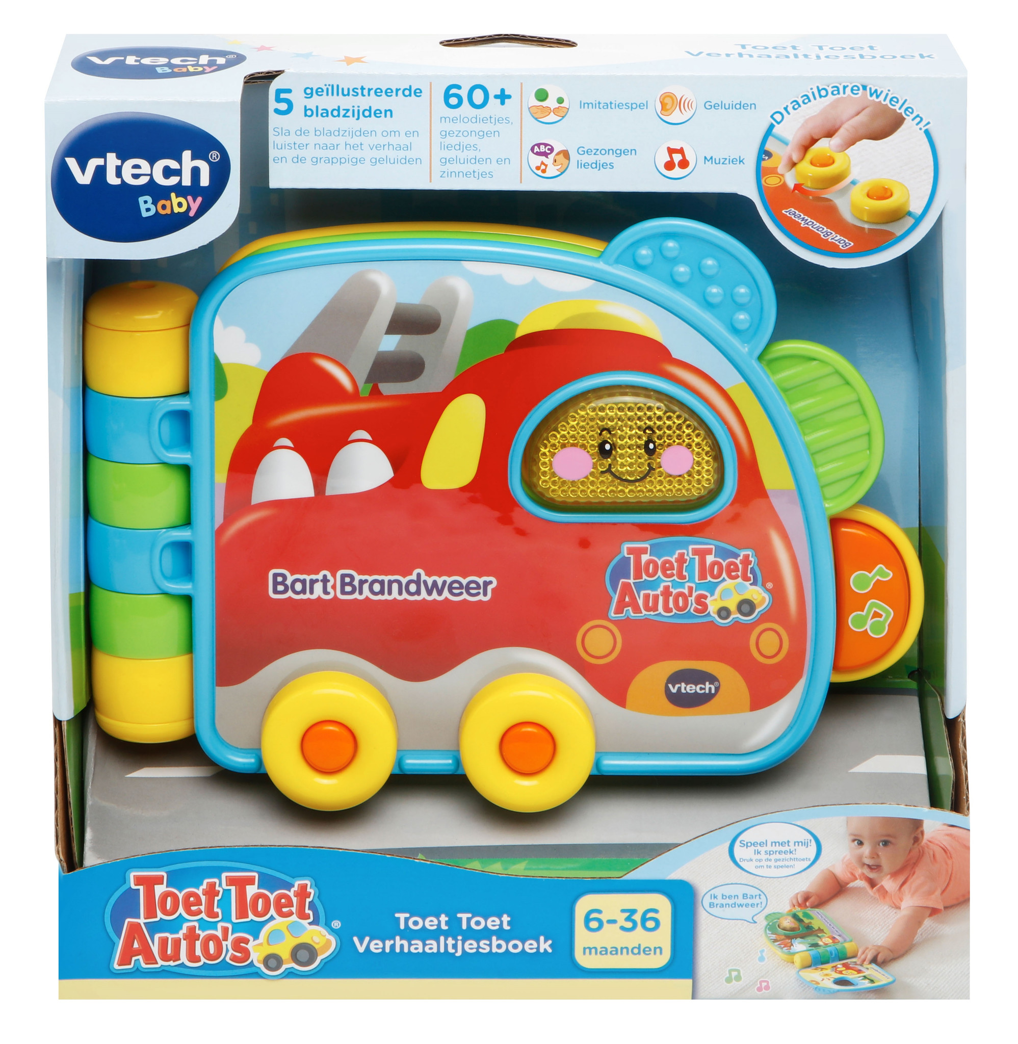 Neem een kijkje in het dagelijks leven van Toet Toet Auto Bart Brandweer. Sla de bladzijden om en luister naar het verhaal. Druk op de toetsen om nog meer vrolijke zinnetjes, grappige geluiden, gezongen liedjes en melodietjes te horen. Met knipperende gezichttoets en draaibare wielen.