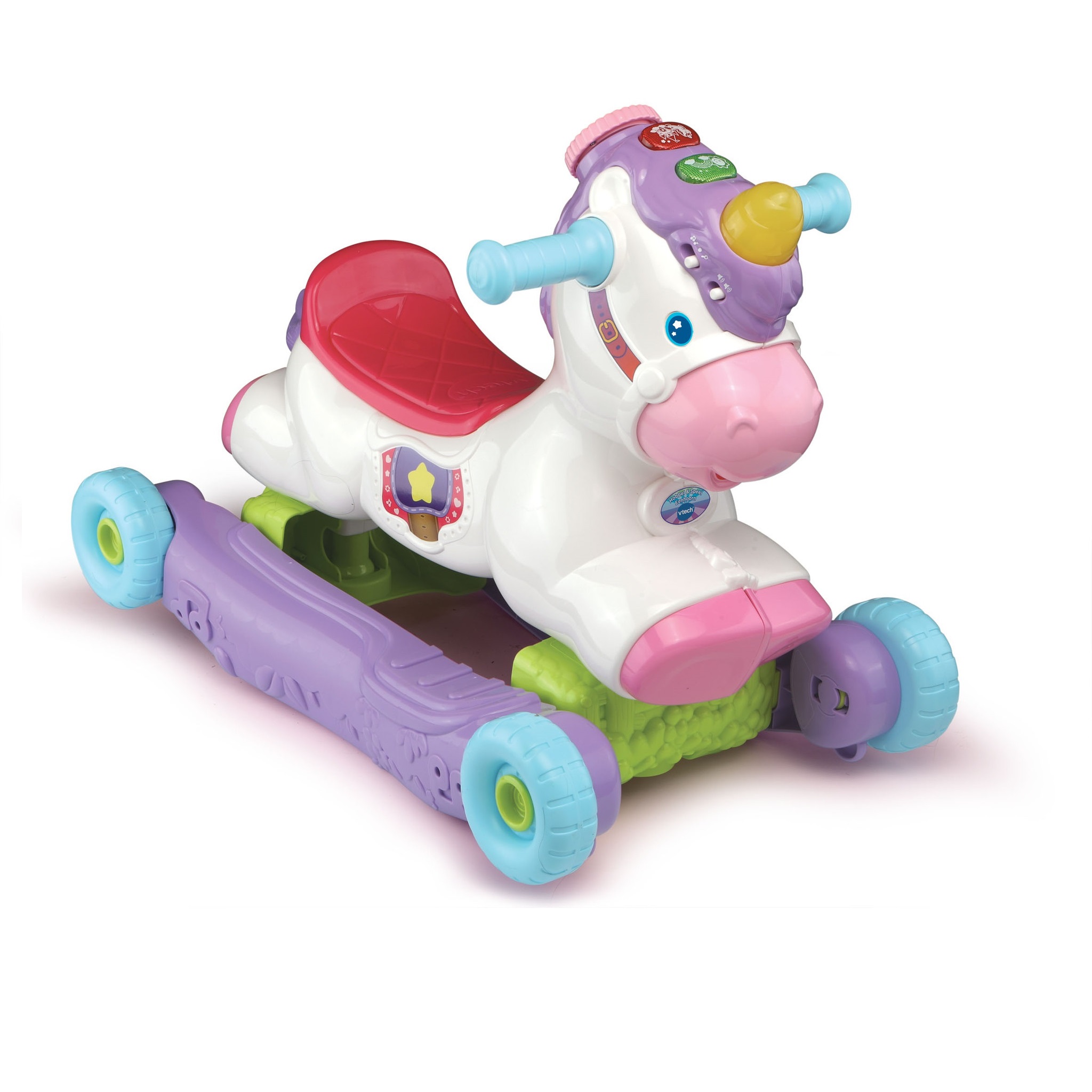 Druk op de toetsen en maak kennis met kleuren en vrolijke zinnetjes. Deze Hobbel en Speel Eenhoorn heeft twee speel standen. Luister naar de grappige geluiden en gezongen liedjes. De eenhoorn is eenvoudig te transformeren naar een loopwagen voor nog meer