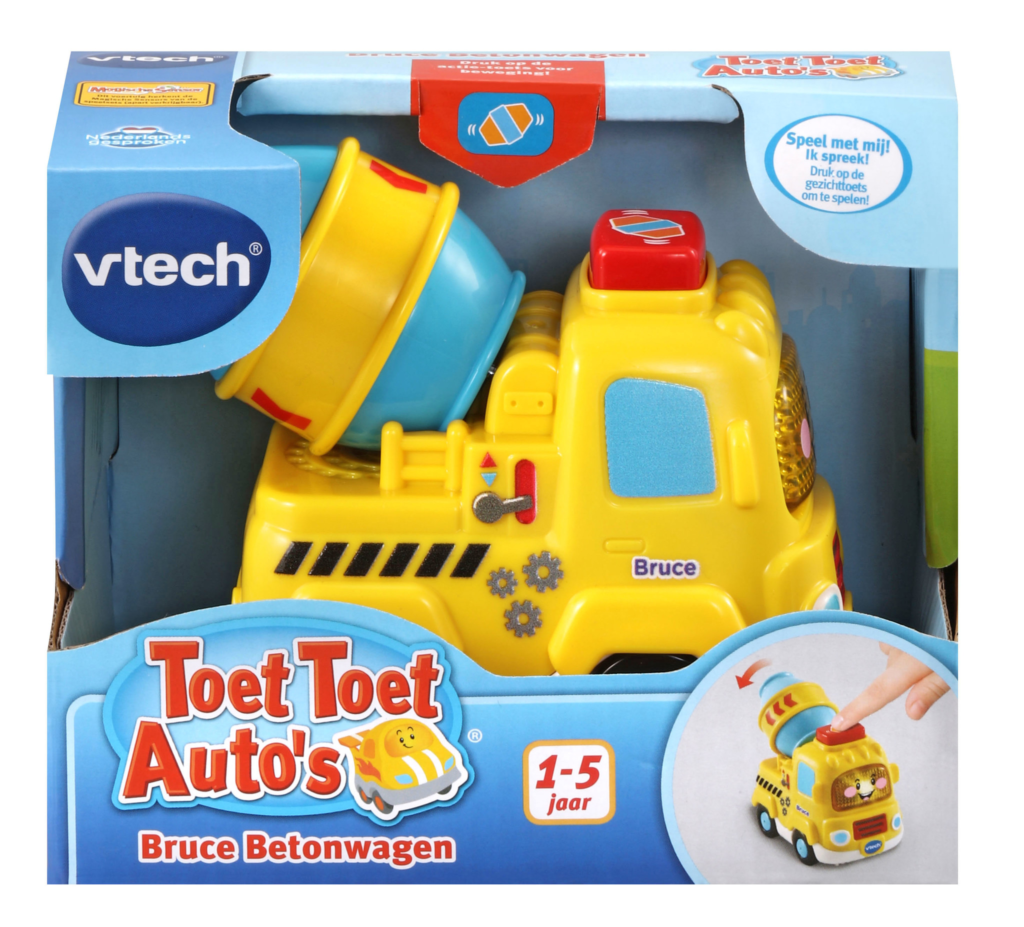 Verzamel alle voertuigen uit de Toet Toet Auto’s collectie! Druk op de knipperende gezicht-toets om geluidseffecten, vrolijke zinnetjes en gezongen liedjes te horen. Druk op de actie-toets om de trommel te laten draaien en grappige geluidjes te horen. Kom