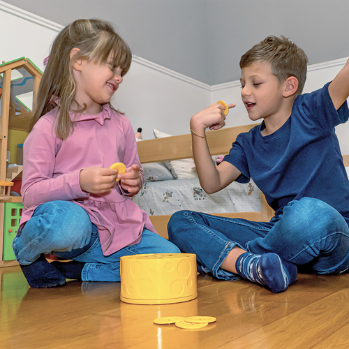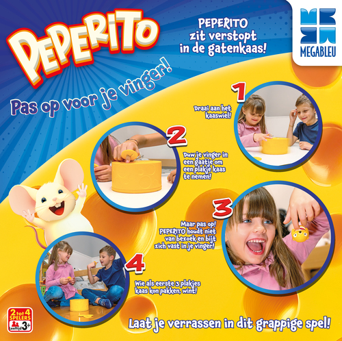 Peperito zit verstopt in het kaaswiel… maar waar precies? Draai aan het kaaswiel en steek je vinger in een gaatje om een plakje kaas te stelen. Maar pas op! Peperito is dol op zijn kaas en deelt niet graag… Voor je het weet, bijt hij zich vast in je vinger! Wie als eerste 3 plakjes kaas weet te pakken zonder gebeten te worden, wint het spel! Peperito is een grappig en spannend spel voor kinderen vanaf 3 jaar. De speelse spanning en onvoorspelbaarheid zorgen keer op keer voor veel gelach en plezier.