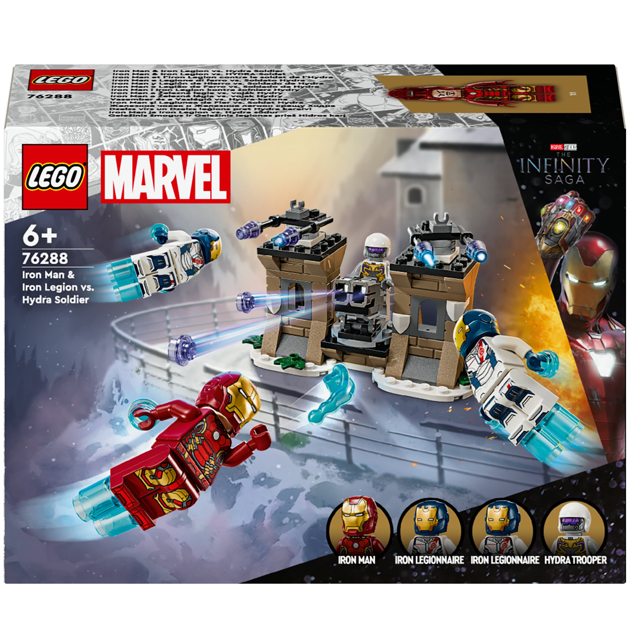 Het LEGO® Marvel Iron Man & Iron Legion vs. Hydra soldaat (76288) bouwbare superheldenspeelgoed bootst een scène uit Marvel Studios’ Avengers: Age of Ultron na waarin Iron Man en 2 Iron Legionnaires naar de versterkte basis van een Hydra Trooper vliegen.