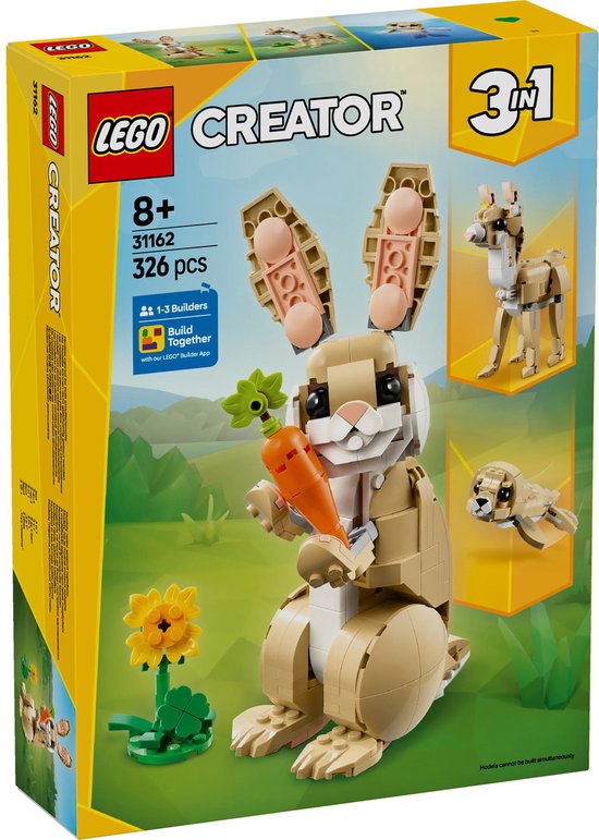 Laat dierenvrienden vanaf 8 jaar leuke avonturen beleven met deze LEGO Creator 3in1 Lief konijn (31162) . De dieren bestaat uit een bouwbaar konijn met een verstelbare kop oren voorpoten en achterpoten die op 2 of 4 poten kan staan en wordt geleverd met een zonnebloem en een wortel.Meisjes en jongens kunnen 3 verschillende LEGO dieren bouwen met dezelfde set stenen: een verstelbaar konijn met een zonnebloem en een wortel een verstelbare lama met groen gras en een halve wortel en een zeehond met een stuk ijs en een vis. De 3 taferelen vormen een geweldig cadeau voor kinderen om fantasierijk mee te spelen en neer te zetten.LEGO Creator 3in1 sets prikkelen de fantasie met 3 verschillende bouwmogelijkheden in elke doos. Kinderen zullen de modellen graag bouwen herbouwen en opnieuw bouwen. De LEGO Builder app biedt een leuke modus om deze set samen te bouwen met vrienden en familie. Let op: de modellen kunnen niet tegelijkertijd worden gebouwd.