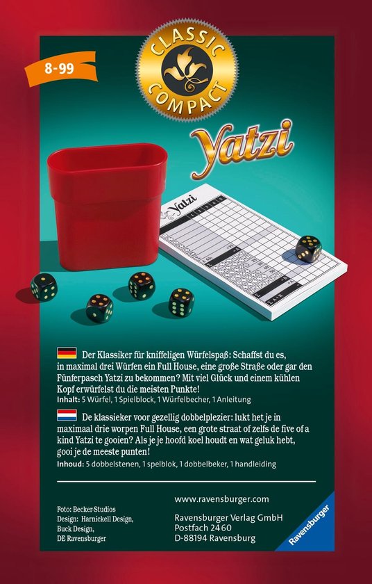 De klassieker voor gezellig dobbelplezier: lukt het je in maximaal drie worpen Full House, een grote straat of zelfs de five of a kind Yatzi te gooien? Als je je hoofd koel houdt en wat geluk hebt, gooi je de meeste punten!