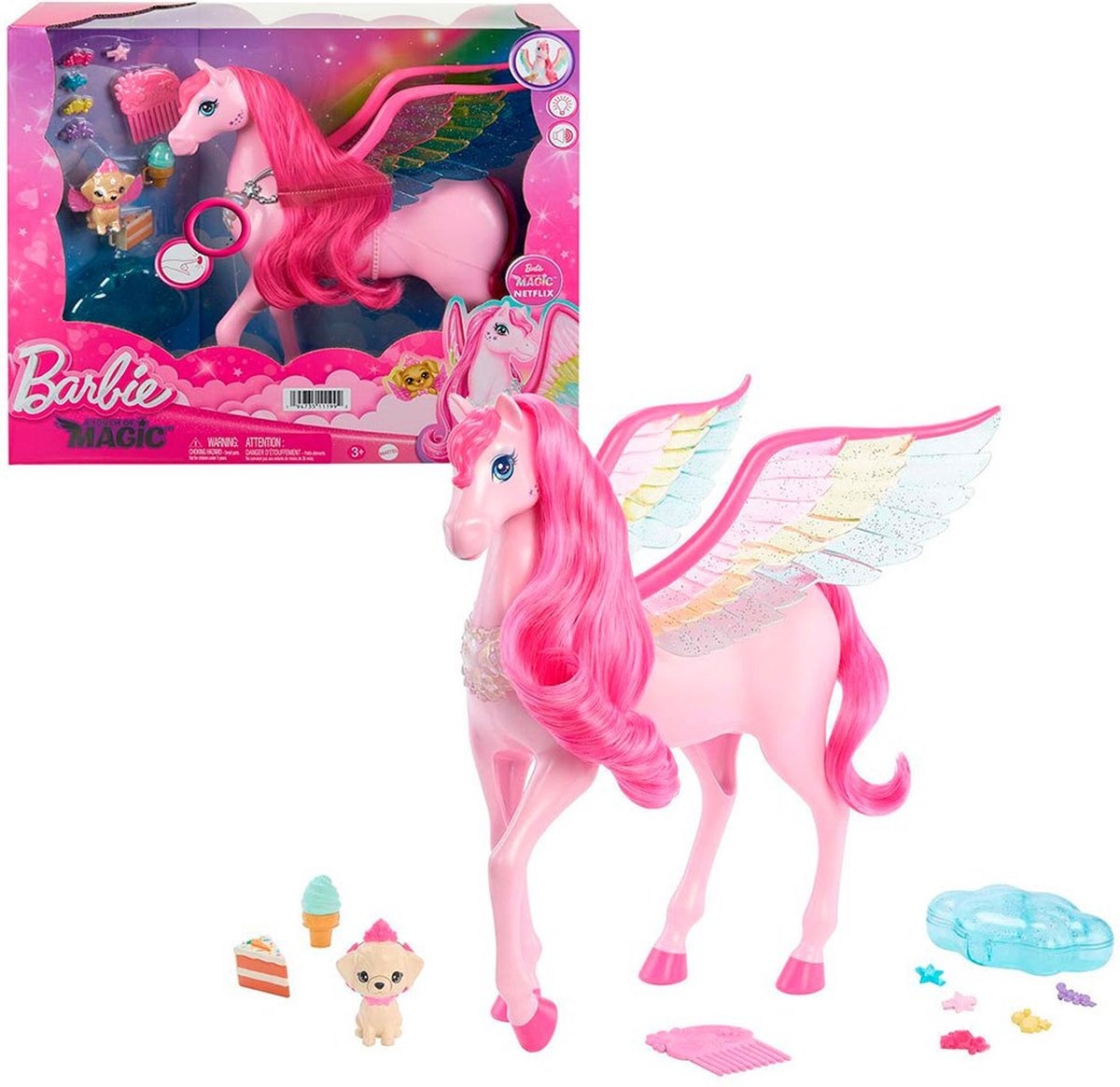 Geef je fantasie vleugels met deze roze Barbie Pegasus! Kids kunnen hun favoriete scènes uit de Barbie A Touch of Magic naspelen of hun eigen fantastische verhalen bedenken. Pegasus heeft regenbooglampjes en geluiden die je op verschillende manieren ku